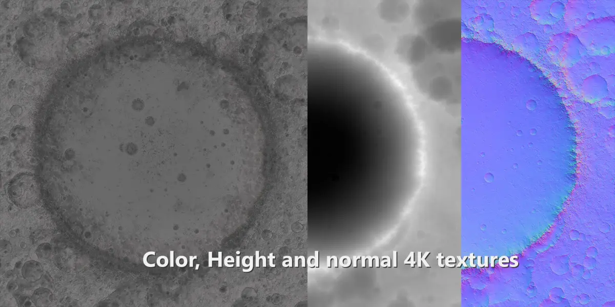3 x 4K .png textures:Height (displacement map)Normal mapColor map