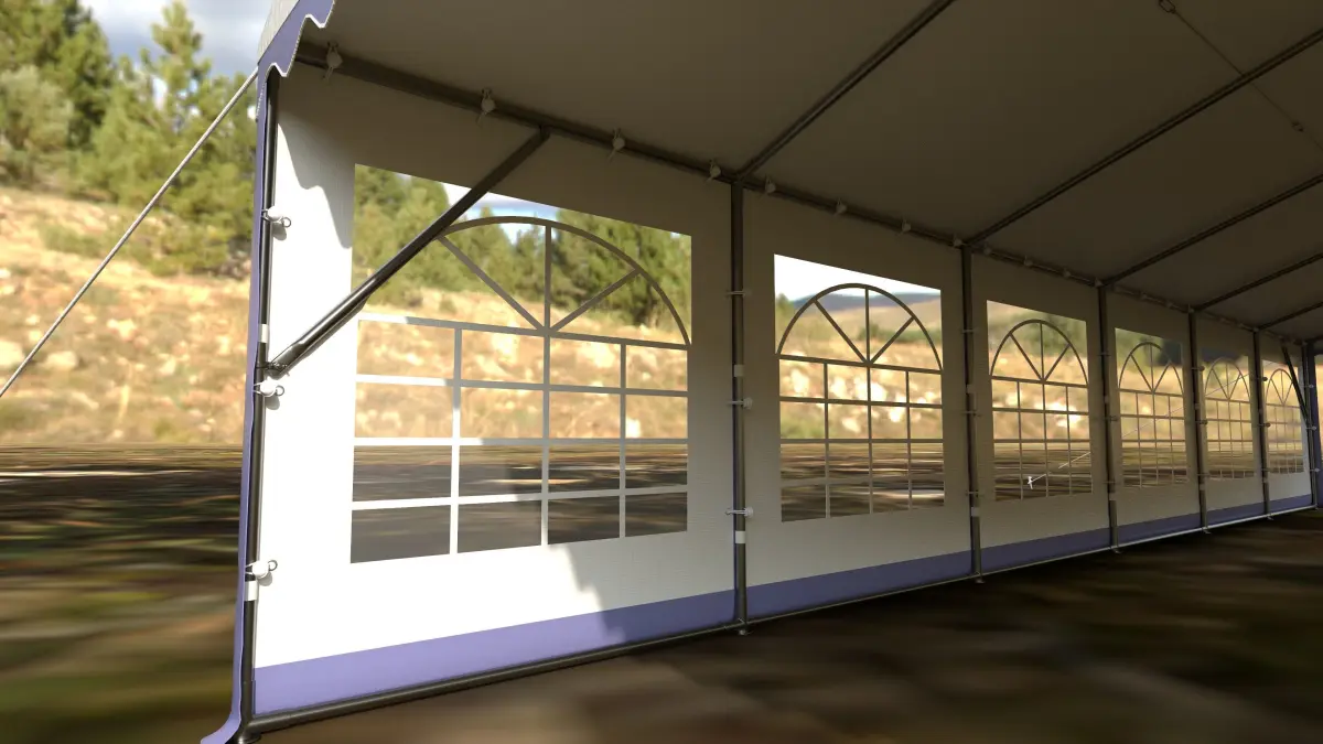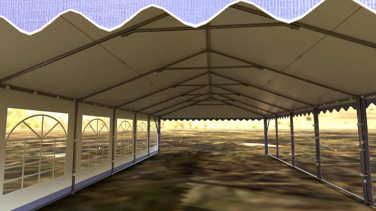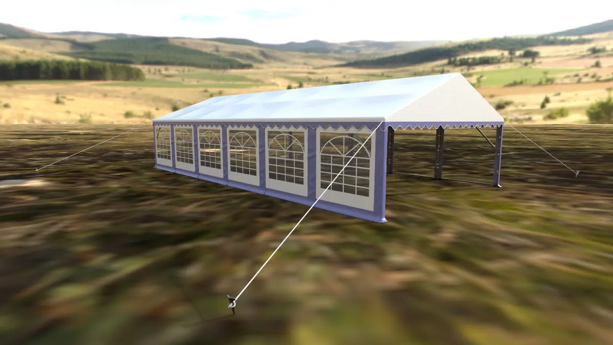 This detailed 3D model of a large outdoor event tent is ideal for architectural visualization, animation, game development, or VR/AR scenes. Created in Autodesk Maya and textured in Substance Painter, this model captures realistic tent details like metal supports, ropes, fabric seams, and window panels.