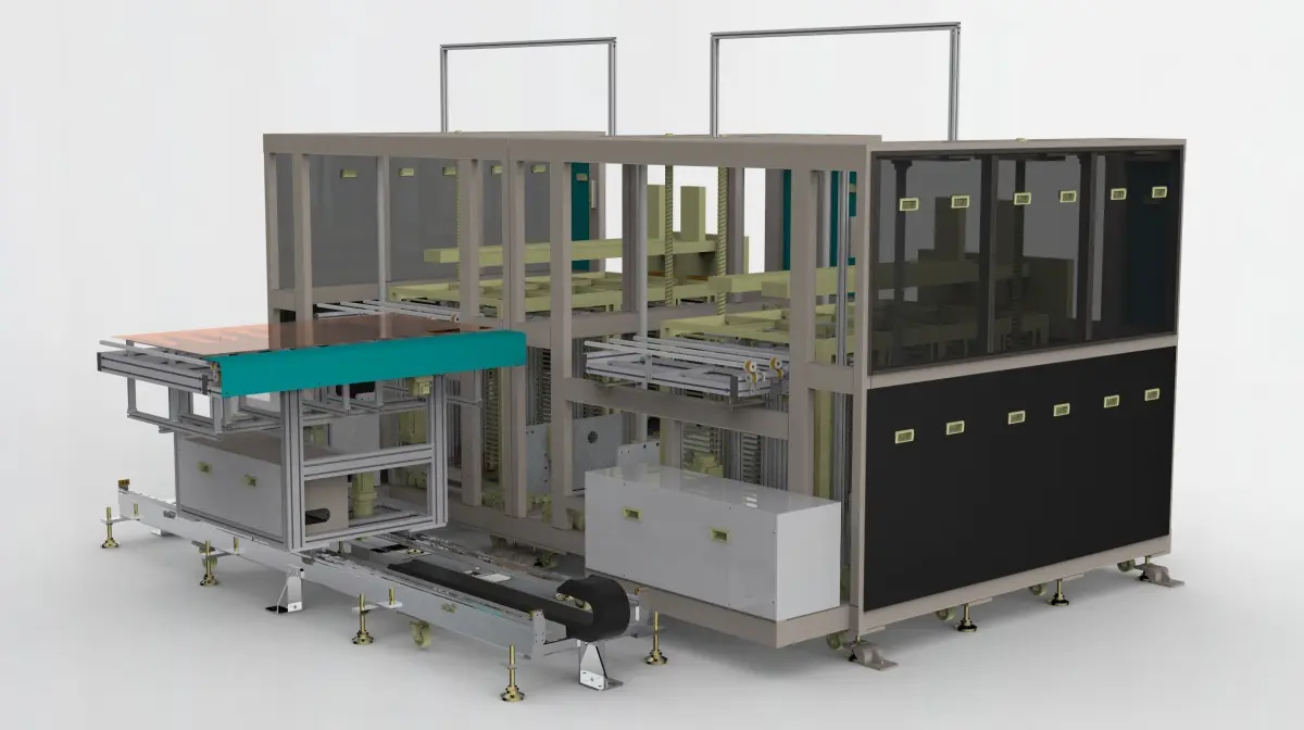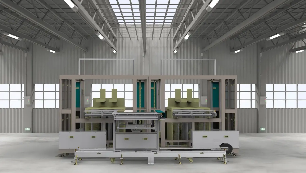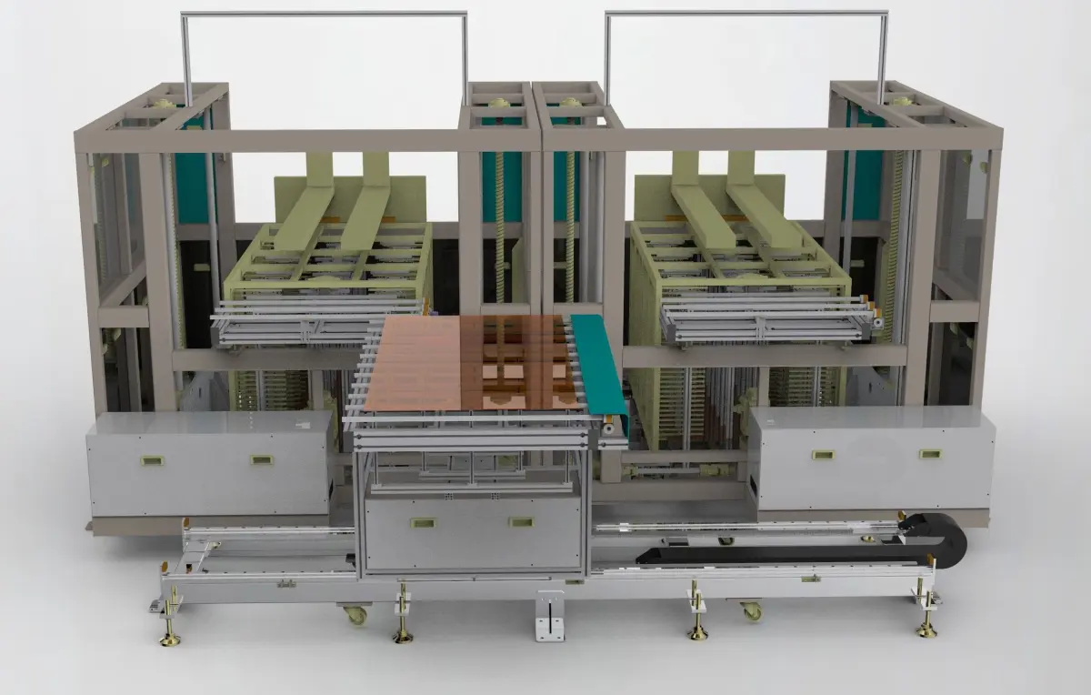 The whole product fixture is loaded into one big box fixture, and the crane lifts the whole fixture to other working positions to realize the whole work flow of receiving and sending materials.When the work is reversed, the machine becomes a unloading device