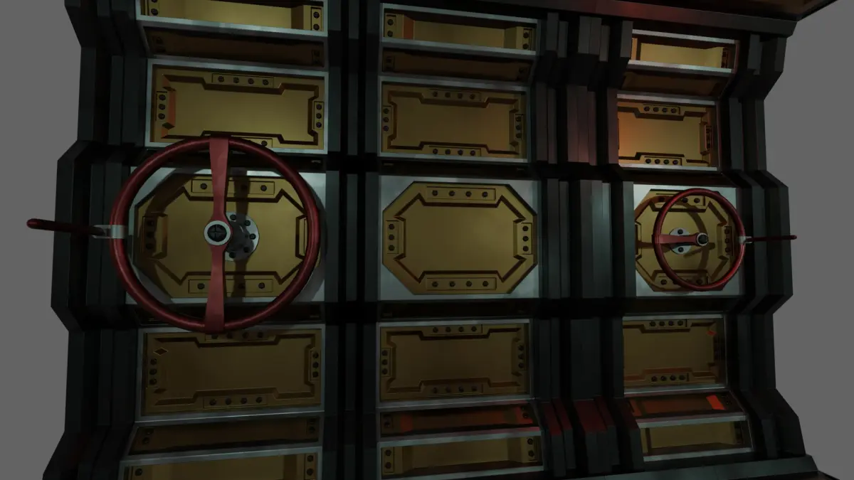 It seems the power is out. Not so worry, we can open the doors via the large turnwheel on the side wall there! Move crewman, we have work to do! Get those doors open!