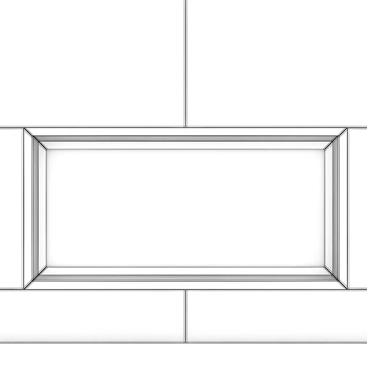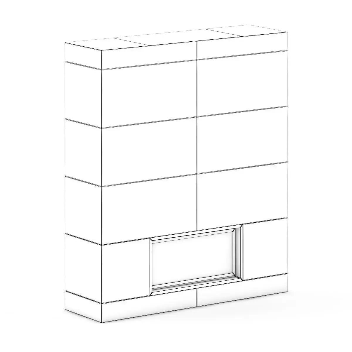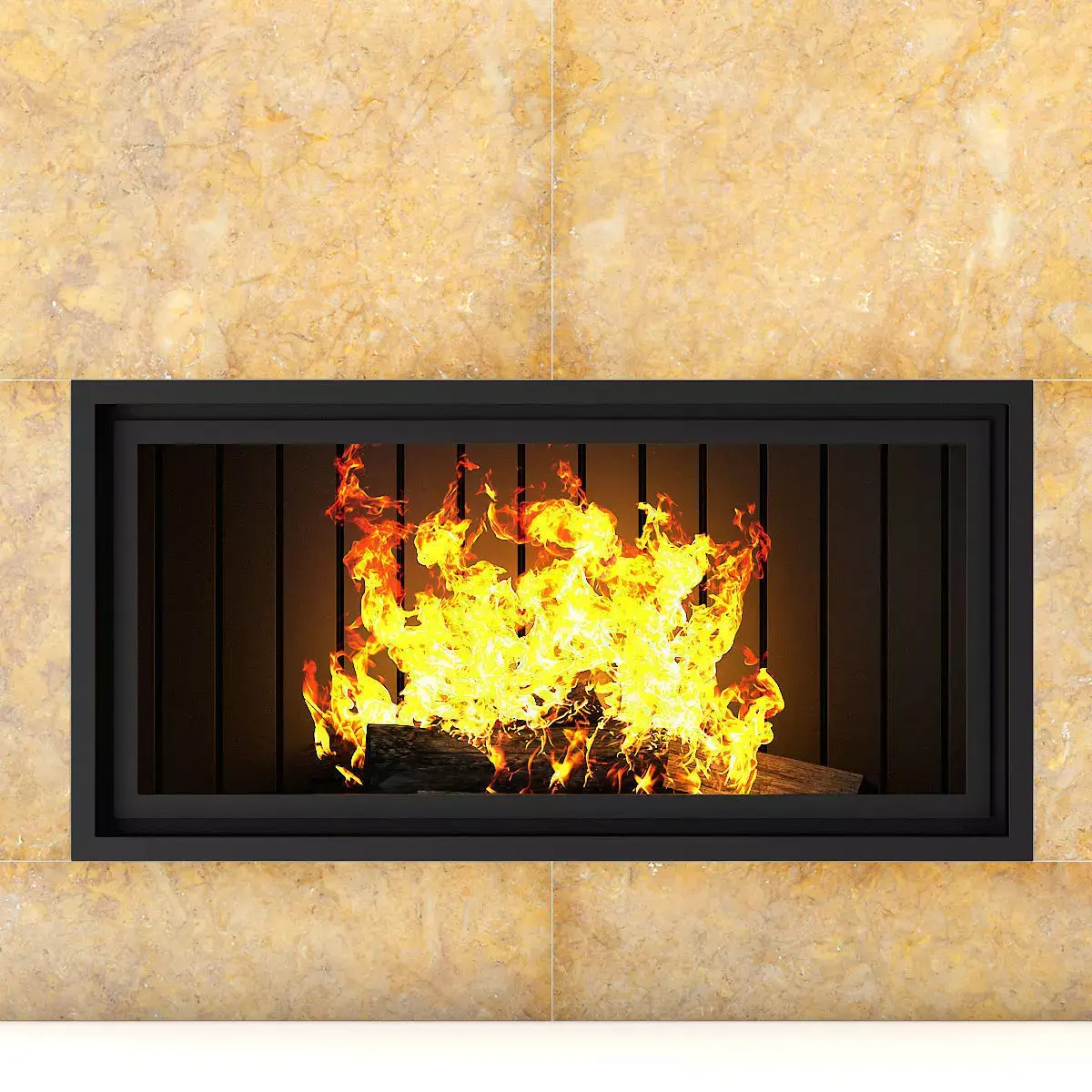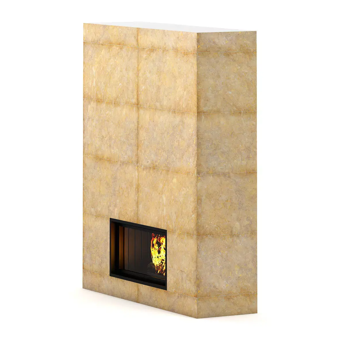 Large wall fireplace with glass door. It is made of yellow sandstone plates. This 3D model contains illuminative fire material.