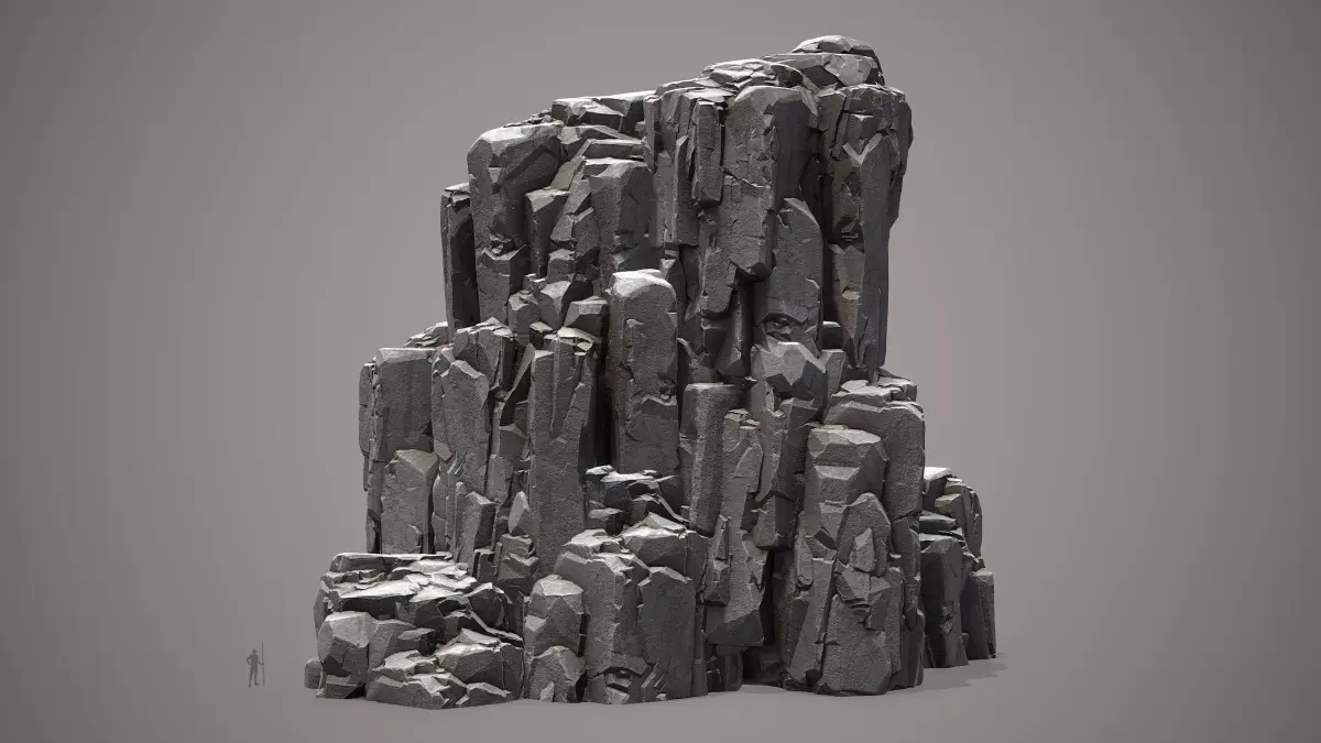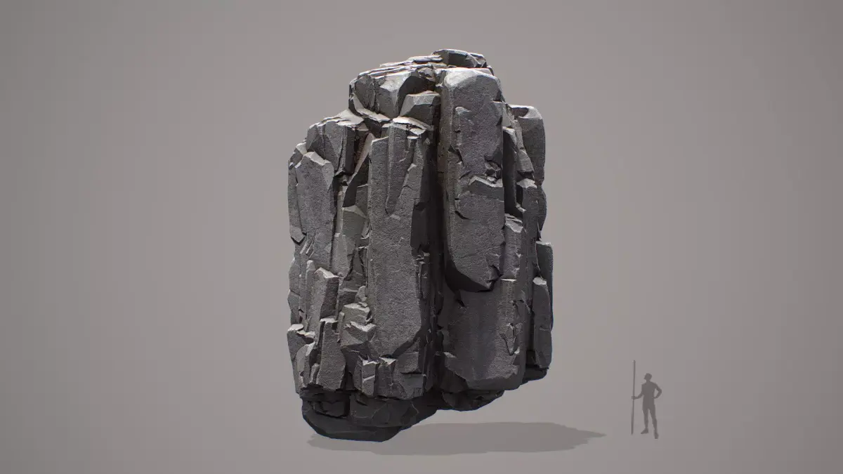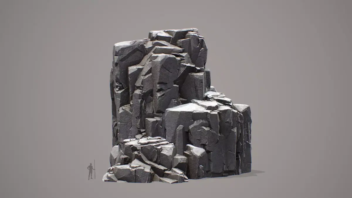This modular asset may be used to create large cliff or mountain constructs, as demonstrated. Can make near unlimited rock variations using only one asset. This object was sculpted in ZBrush, UVs in Blender, PBR textured in Substance Painter and rendered in Marmoset Toolbag.