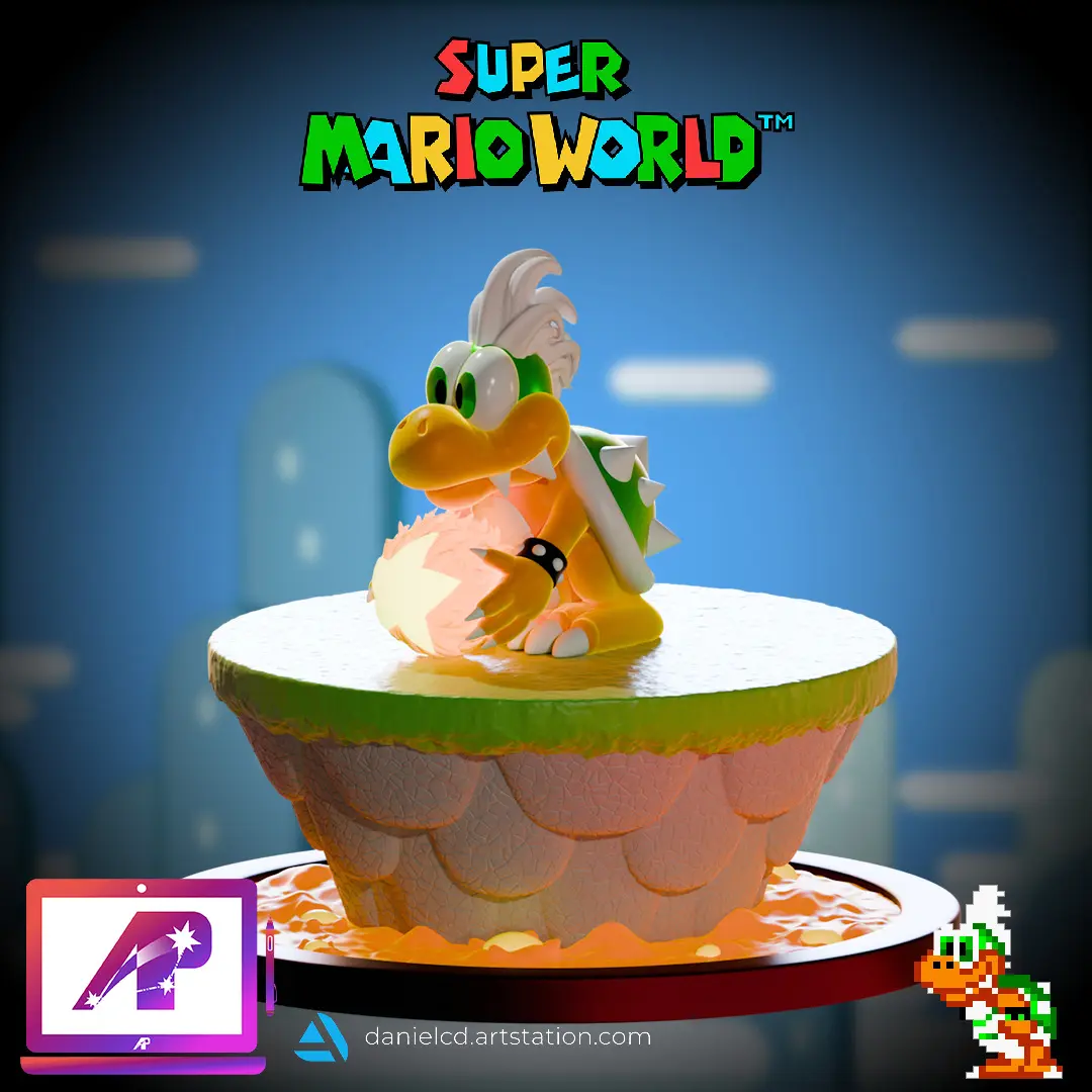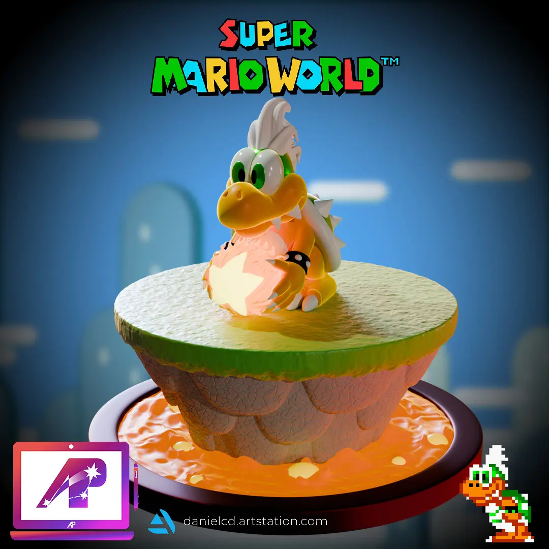 NOTE: Only head and Magic Ball, the rest is in Iggy's model.Larry's second appearance is in the last world of Super Mario World, the Valley of Bowser. In battle, he uses Iggy's attack pattern and defeating condition. He sits on top of a tilting platform on top of lava and is immune to all of Mario's attacks. However, unlike Iggy, Larry's platform has three Lava Bubbles that jumps up and down. He can also throw more than one fireball at one time. Larry needs to be jumped on until he falls off his platform. After the battle, Mario kicks away his castle and gains access to the Front Door. This is Larry's first time being the last Koopaling to fight so far. Like the other Koopalings, his in-game design does not match official artwork.