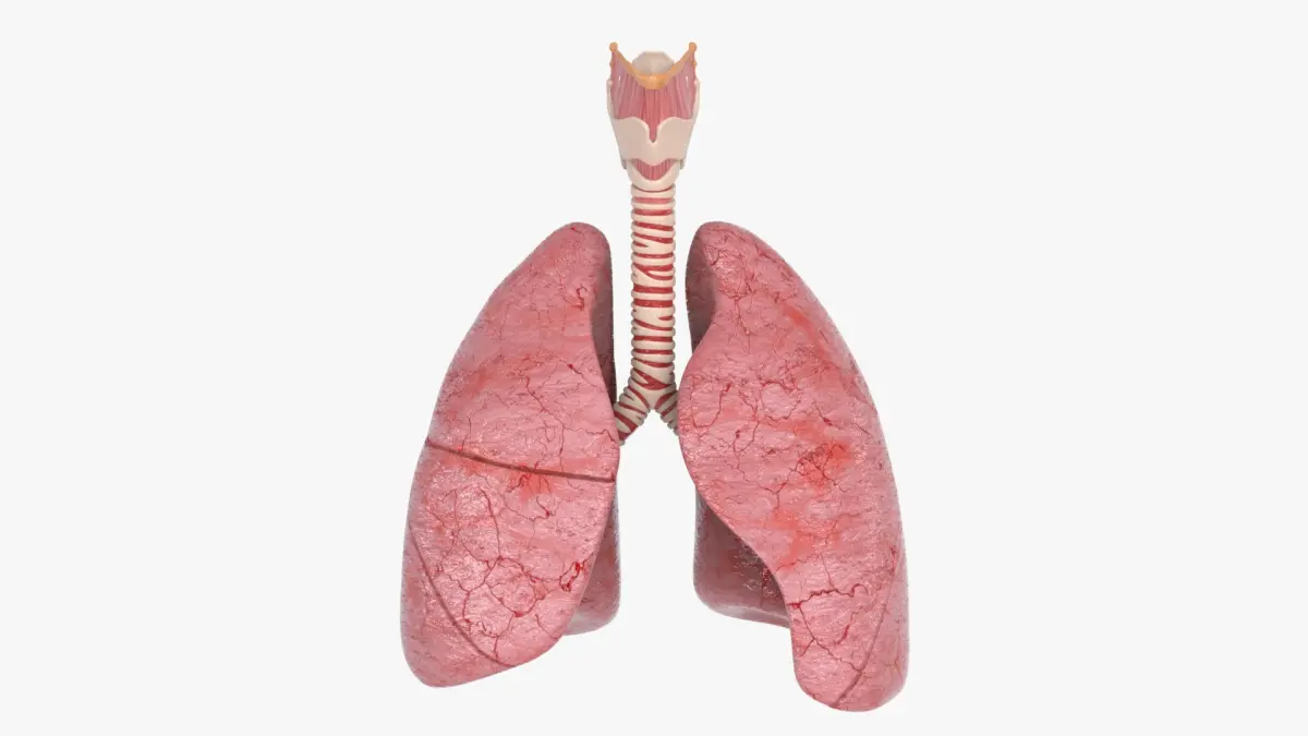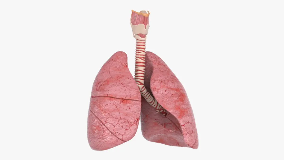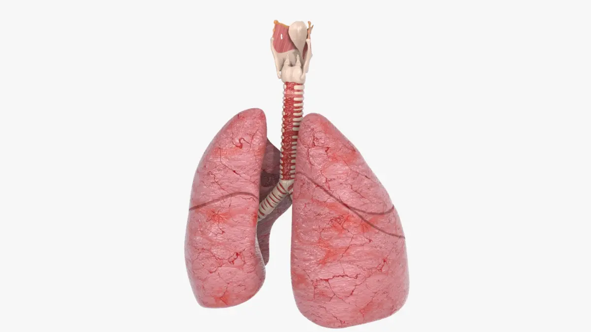 Highly detailed 3D model of the upper respiratory system, featuring the larynx, trachea, and both lungs. This realistic anatomical asset showcases complex structures like the tracheal cartilage rings and lung lobes with precise, PBR-textured materials. Ideal for medical simulations, e-learning platforms, scientific presentations, and accurate anatomical visualizations requiring high fidelity and clean geometry.