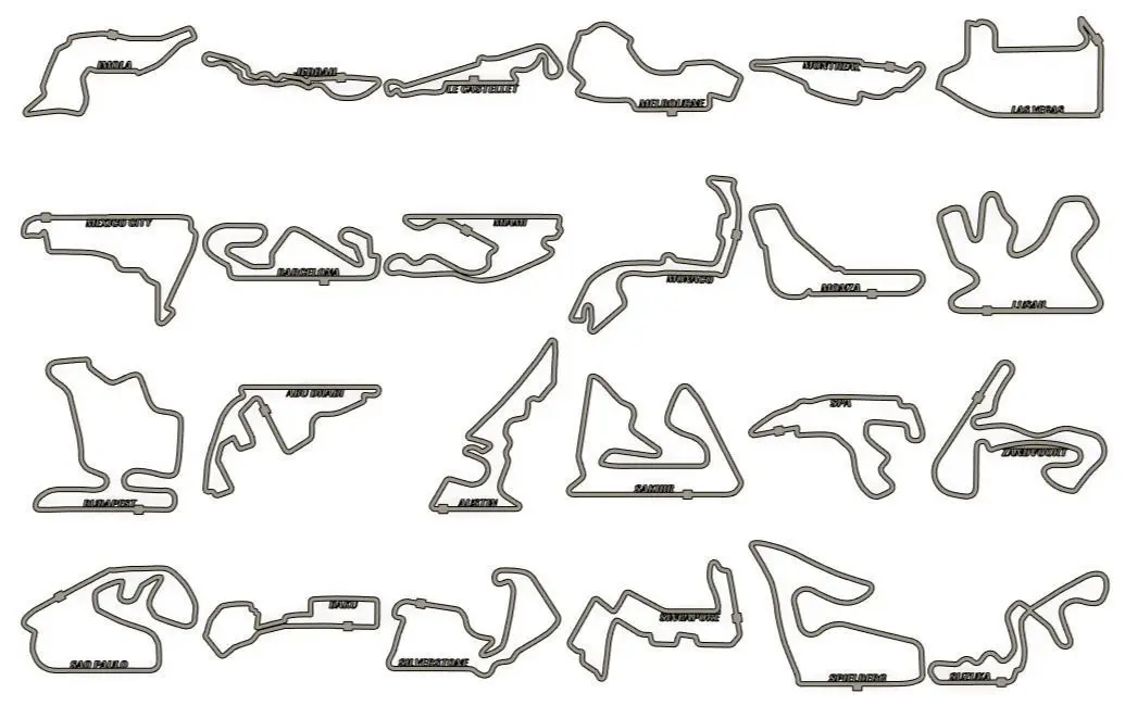 The Track was designed for 3D Printing purposes, each track has their name attached to the model and stands 2mm above the track level, there is also a sqaure block attached to each track indicating the starting position of each track.