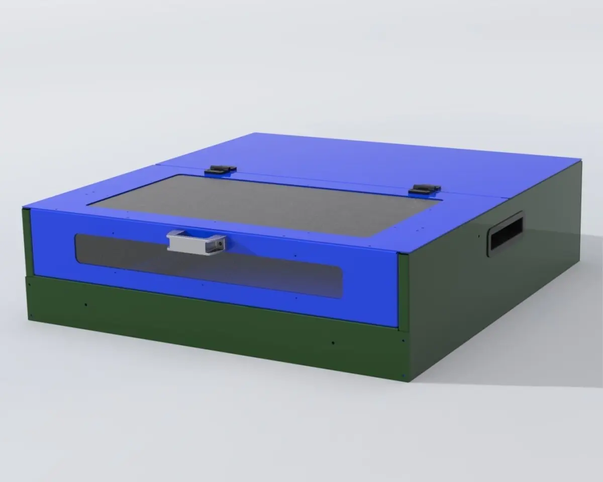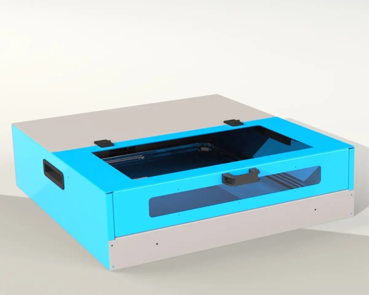 This is Enclosure for small Laser engraving machine.. In the top I used double gate which can be opened with the help of the hinges in the rear. The top gate and the front sheet have open area covered using polycarbonate sheet to facilitate the vision. The enclosure include an exhasut fan at the back.The size of this enclosure could be modified according to your need.In this design there are some interference especially in the corner of the sheet, and the damper is random positioned.The dimension is 740 x 786 x 205 mm.