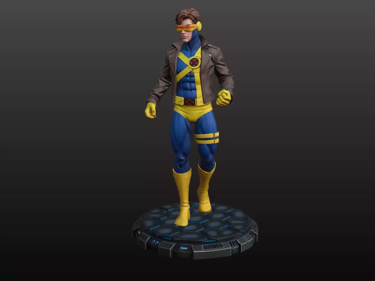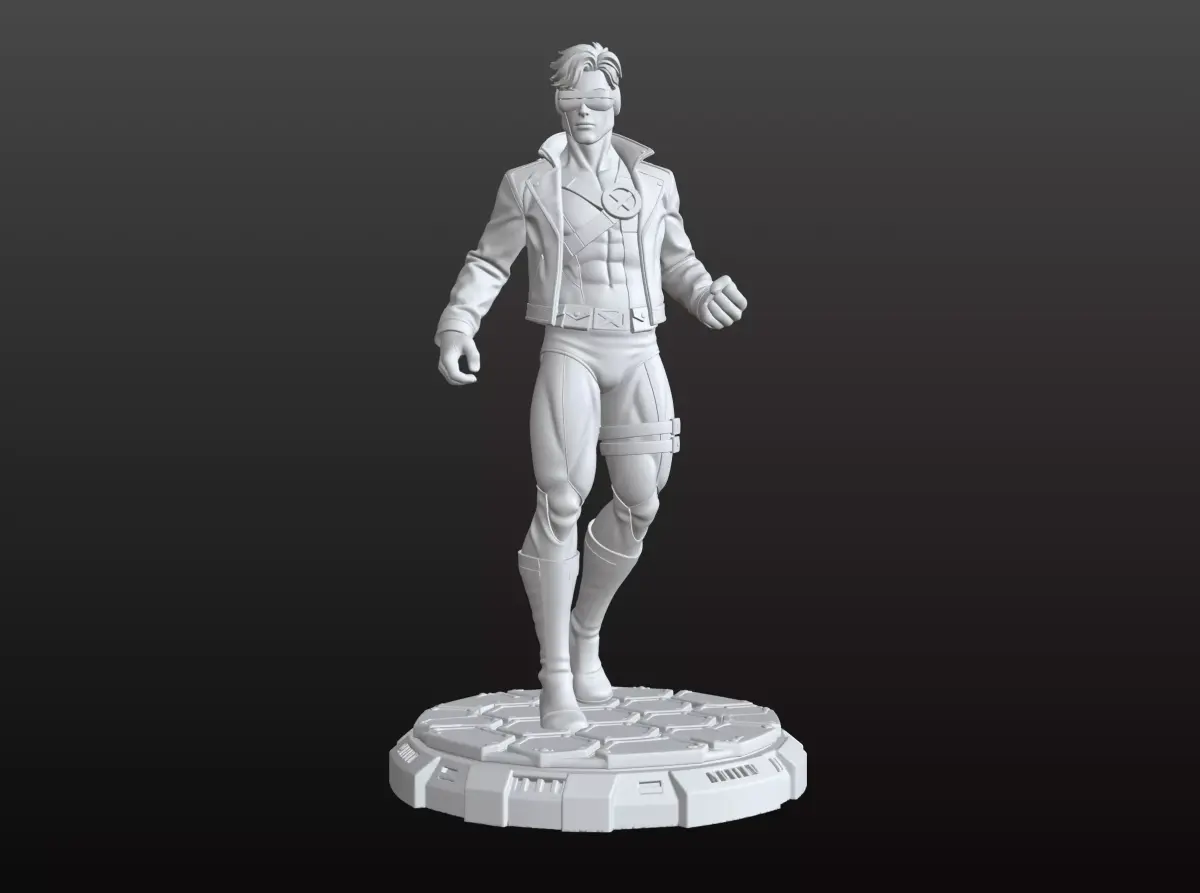 A stunning super hero figure with powerful laser eyes, captured in a dynamic and iconic pose. This character is designed with extremely high and refined details, from the muscular anatomy to the sharp lines of the suit, giving the model a strong and heroic presence. The figure stands on a beautiful futuristic base filled with sci-fi elements that enhance the sense of power and advanced technology. A perfect piece to enrich any collection of heroes, sci-fi figures, or display models.
