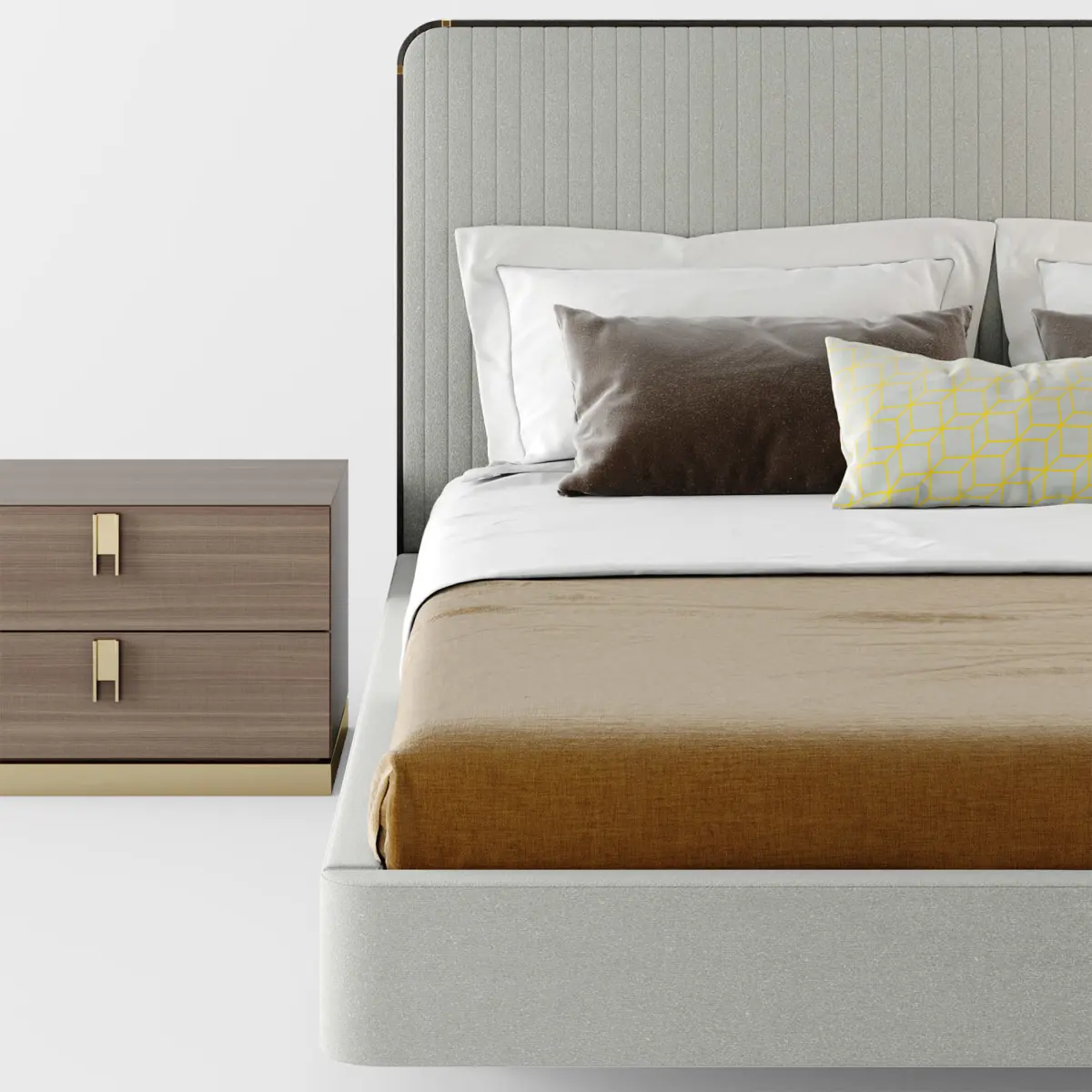 Anny is a double bed with high upholstered headboard in fabric with different customization options. Regardless of your choices, this is a smooth-line piece with stitching headboard, wood details, and metallic features.