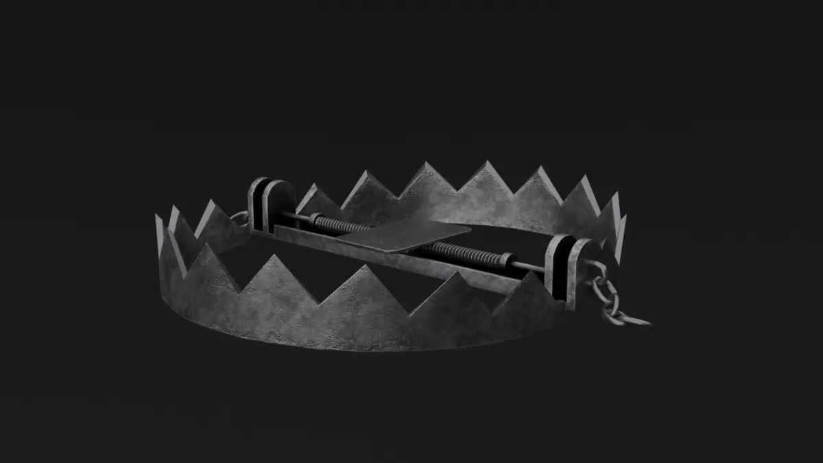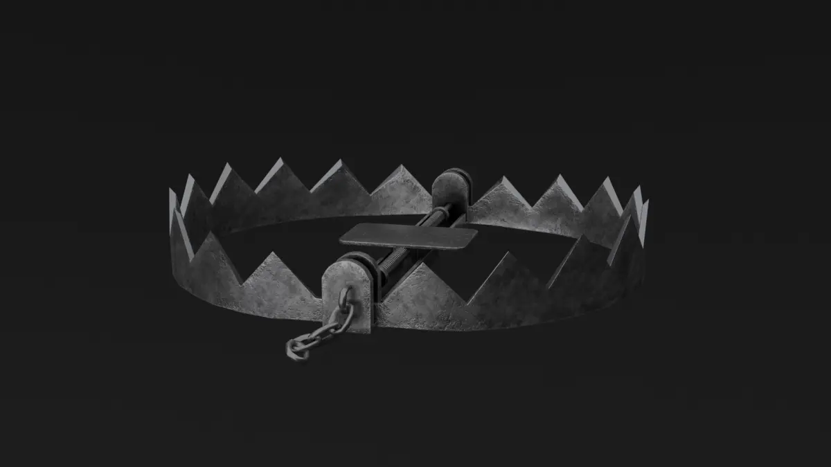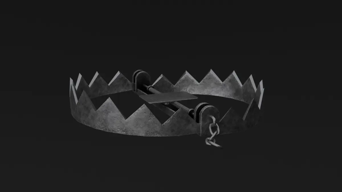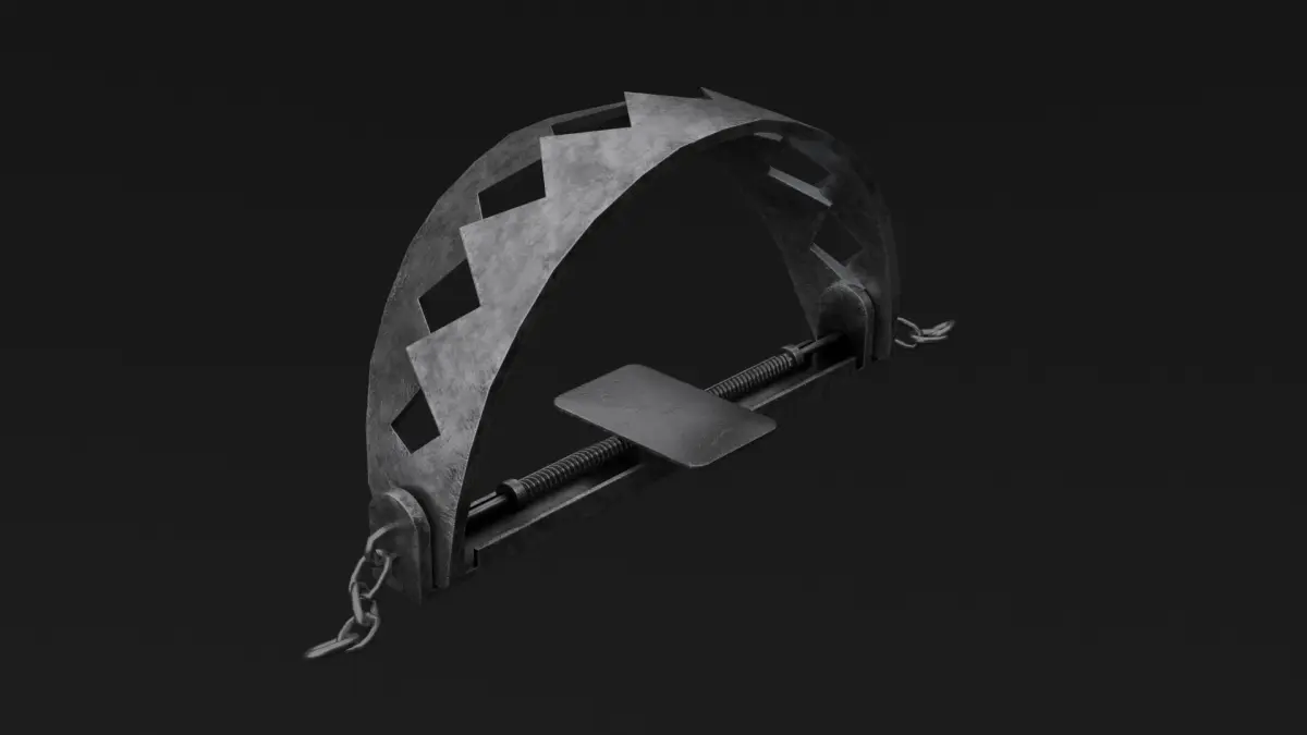 Latch - a metal trap set in a state of rest. Possibility of manipulation of parts. Trap is a heavy-duty mechanical device designed to catch and restrain large animals like bears. Traditionally used in hunting or wildlife management, it is a type of leg-hold trap with powerful jaws that snap shut when triggered by the animal stepping on a pressure plate.