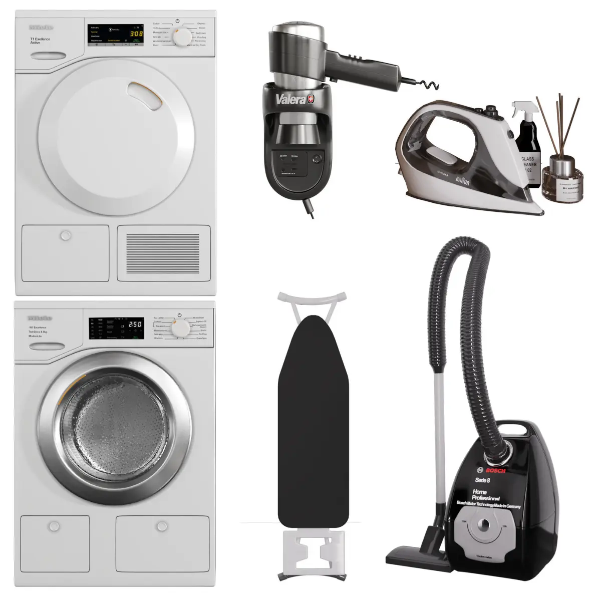 all appliances are separated and can be used.appliances such as vaccum cleaner , hair dryer , washing machine , ironing board , are separated and can be used.All parts are logically named to use easily .