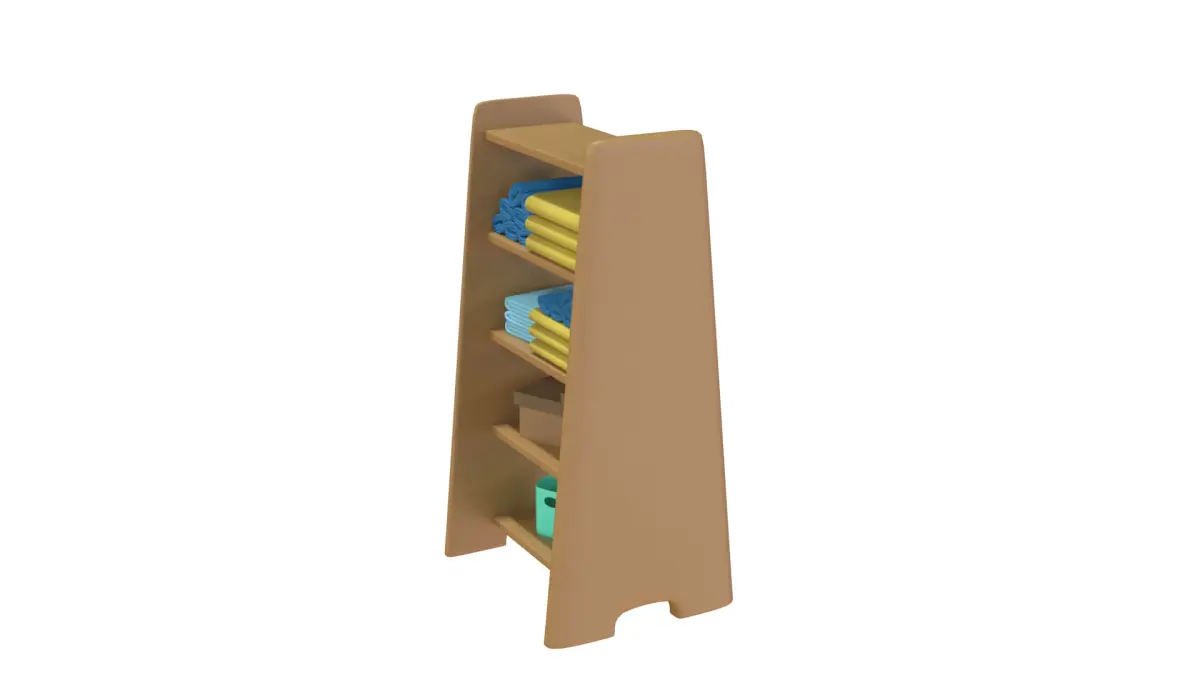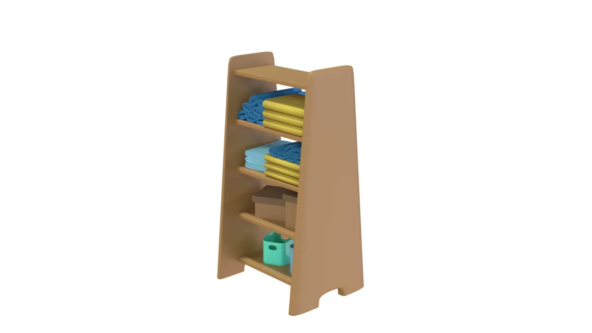 This realistic 3D laundry shelf is a high-quality, detailed asset perfect for interior visualization, animation, or game environments. It features a well-organized wooden shelf stocked with folded towels, cloths, storage boxes, and detergent containers, making it ideal for home organization scenes.