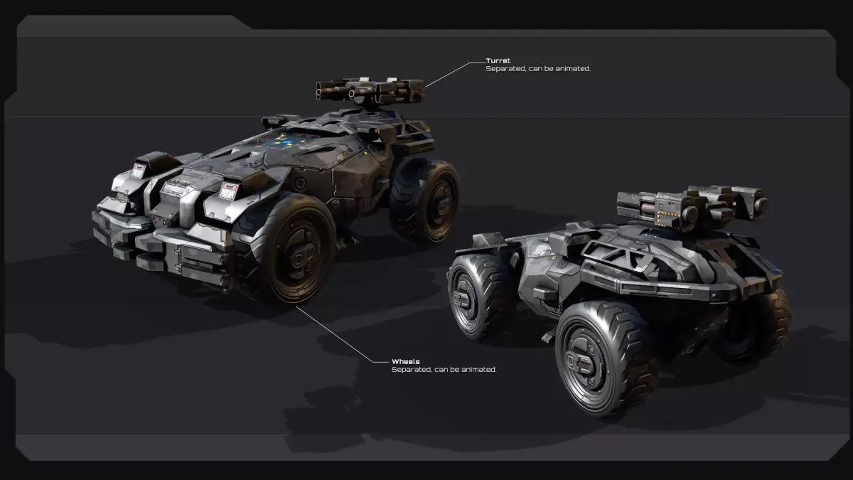 Add a professional touch to your SciFi VideoGame project with this original low poly model. Set of one SciFi vehicule. No animated parts, Separate parts: wheels, weaponry, properly linked (see previews). Check all previews, read descriptions for full details before buying (NO interior / Cockpit).