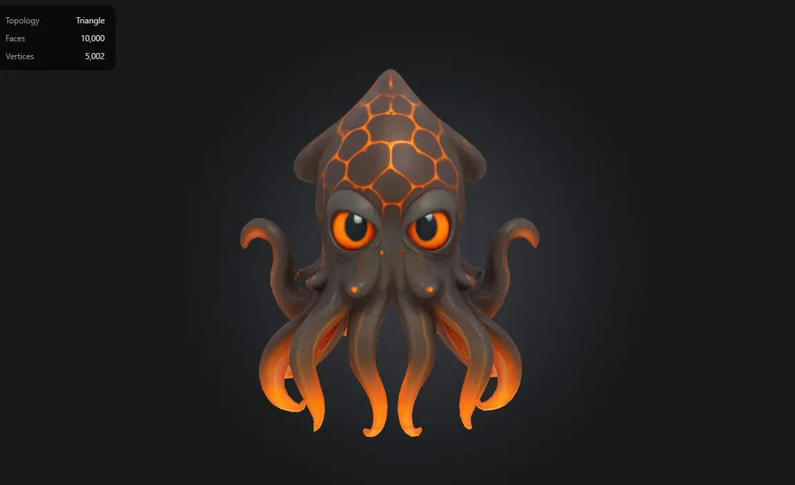 A stylized Lava Squid character designed for fantasy games and animation. Featuring glowing magma cracks, expressive eyes, and smooth, tentacled movement, this unique creature combines underwater and volcanic aesthetics for a fiery, cartoonish appeal. Optimized for use in games and creative projects, with clean topology and a balanced polycount.