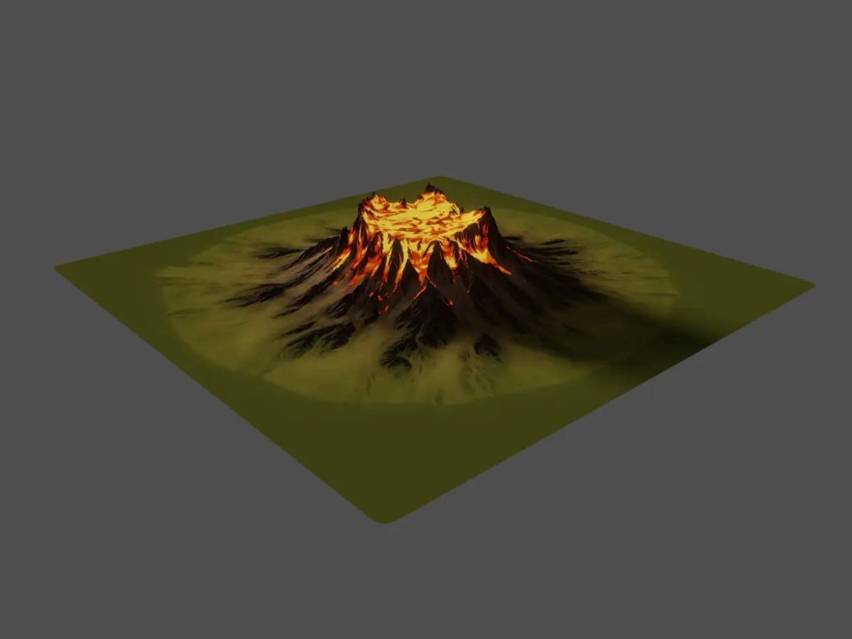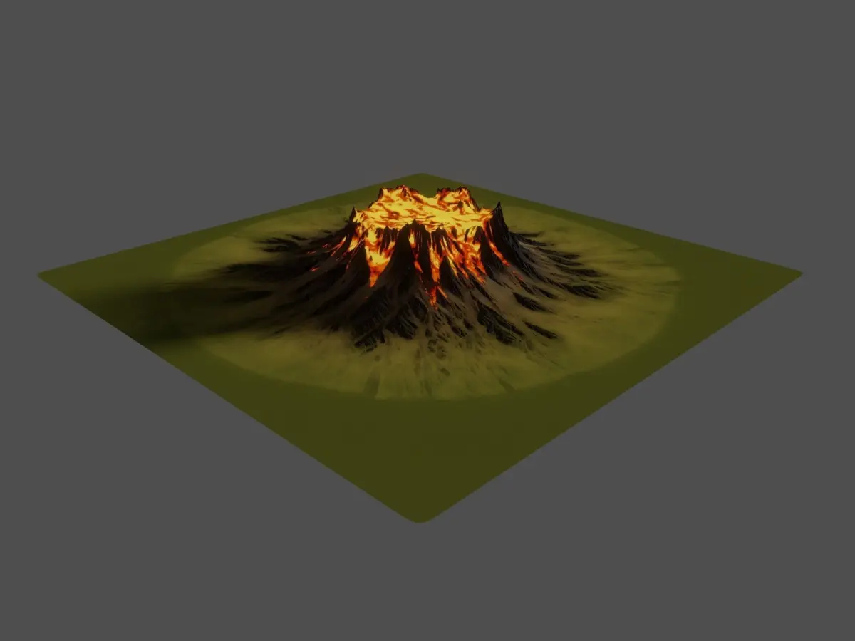 Erupting lava volcano mountain landscape model with PBR textures including colour, normal, spec, roughness, and emission. All textures are 4097 x 4097 px PNG. I have also included the heightmap for those that wish to recreate the model from scratch.