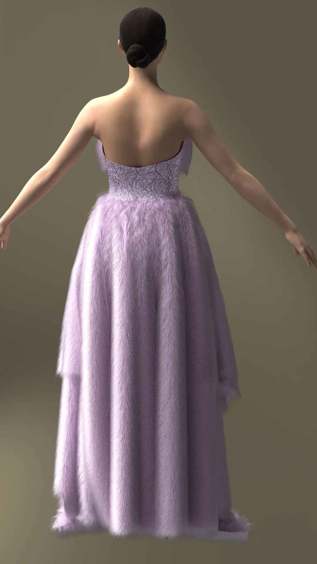 This stunning 3D model showcases an elegant lavender evening gown, designed to bring sophistication and glamour to any scene. The strapless dress features a luxurious fur-textured bodice and cascading fur-trimmed layers that flow down the back, creating a high-low silhouette with a dramatic train. The fitted inner layer is detailed with intricate, shimmering embroidery, adding a touch of sparkle that enhances the gown’s ethereal feel. Perfect for fashion scenes, character design, or virtual fashion shows