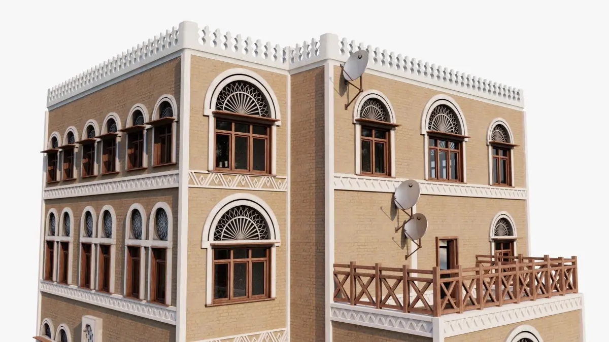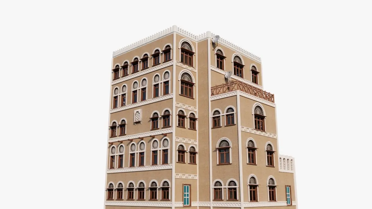 Inspired by traditional Yemeni architecture, featuring characteristic elements such as adobe walls, ornate wooden windows, and distinctive geometric patterns. This Yemeni apartment building consists of multiple floors and rooms. The building includes a detailed exterior and interior made up of modular pieces that allow for customisable layouts. The model is composed of 17 materials with a mix of overlapping and non-overlapping materials.