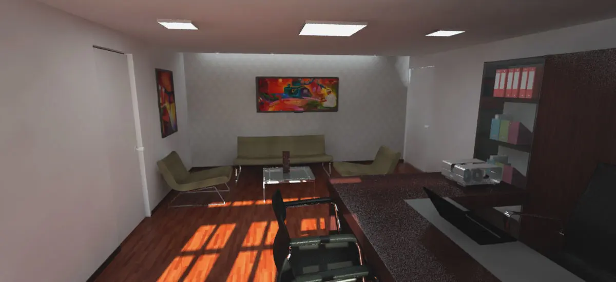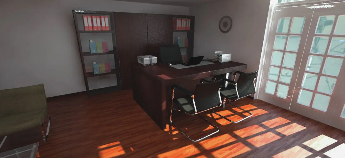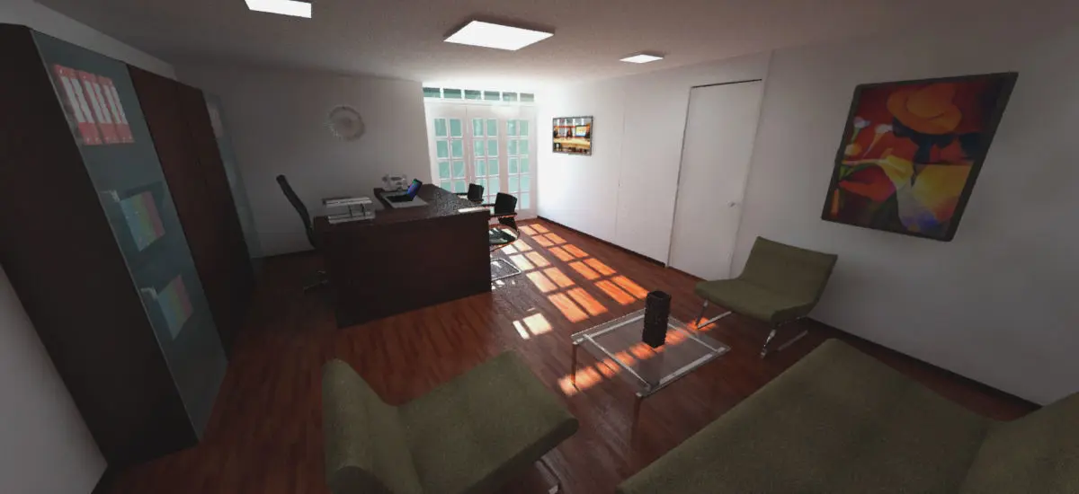 Modeling of law office with living room, bathroom, bookcase and door to the patio