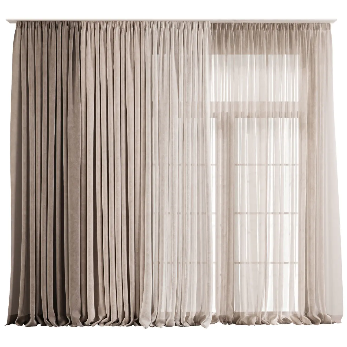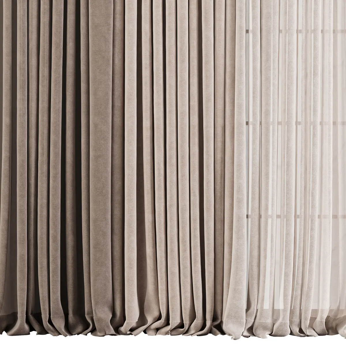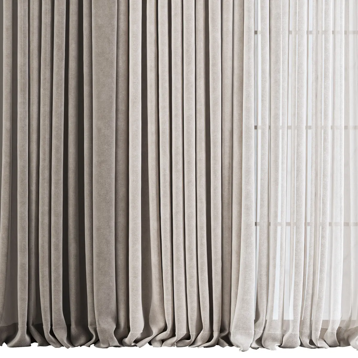 Description:Realistic 3D model of a double-layer curtain set designed for full-height or large windows. The combination of a dense outer layer with a lightweight sheer inner curtain creates a balanced look that provides both privacy and natural light. Ideal for modern and minimal interiors, with natural pleats and soft fabric fall for photorealistic renders.