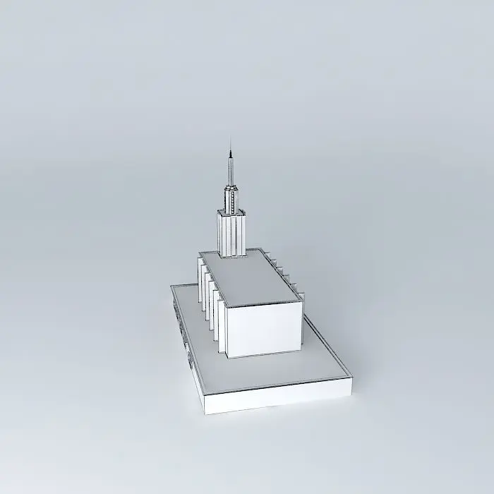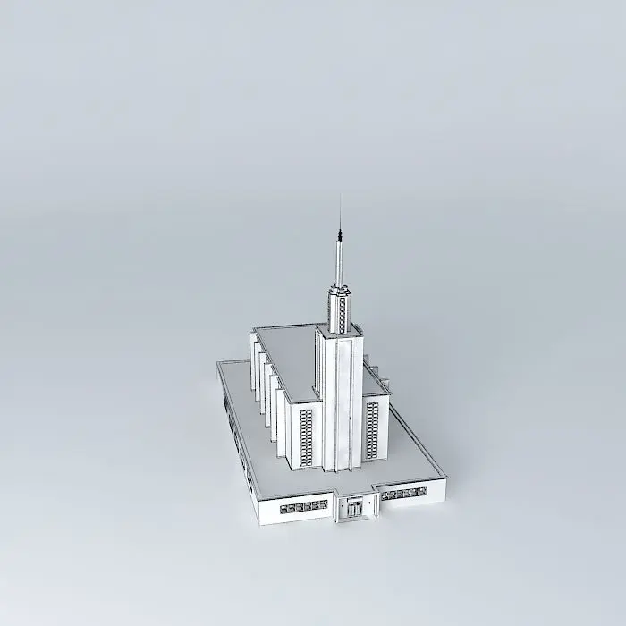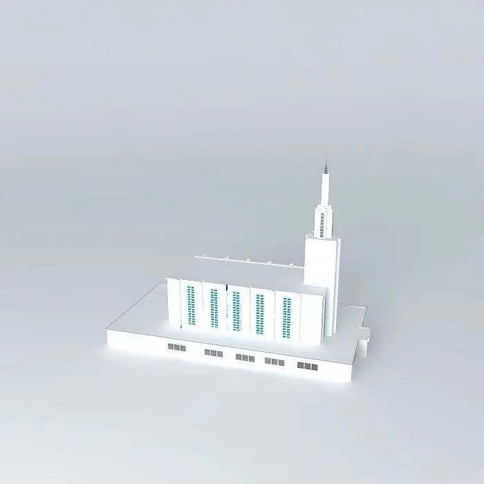 This 3D model was originally created with Sketchup 13 and then converted to all other 3D formats. Native format is .skp 3dsmax scene is 3ds Max 2016 version, rendered with Vray 3.00 Site: 86 acres (including college grounds). Exterior Finish: Reinforced concrete block manufactured at site; white painted structural steel. Temple Design: Modern-contemporary, single-spire design but similar to lines of early Church temples. Number of Rooms: One ordinance room and five sealing. Total Floor Area: 44,212 square feet.
