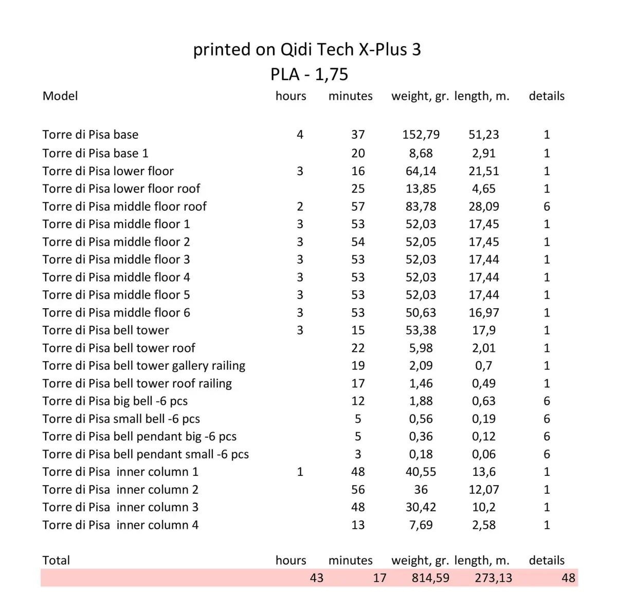This is a set of STL models for self-printing on a 3D printer and assembling the Leaning Tower of Pisa souvenir lamp. The models are designed for printing on a printer with a build area of 280 mm x 280 mm, a 0.4 mm nozzle diameter, and a 0.2 mm layer height.In the original design, PLA filament in white, gray, black, and gold colors was used. The lamp's lighting is designed for an 8 mm wide, 2 m long LED strip. The internal light column features a rotating lock, allowing the LED strip to be replaced at any time.Assembly requires gluing. Some models may require enabling standard supports. These models can be found in the folder models requiring support. Enable support in slicer, but they are also included in the general model list.If you have any questions or difficulties, feel free to contact me. I'm always happy to help!This lamp is not a mass-produced item.• Tower Dimensions: Height – 45 cm (17.7), Diameter – 10 cm (3.9)• Base Dimensions: 26 × 22 cm (10.2× 8.7)• LED strip: 8 mm wide, 2 m long• Material: PLA plasticThis unique lamp will be a stunning addition to your home or serve as a great gift.