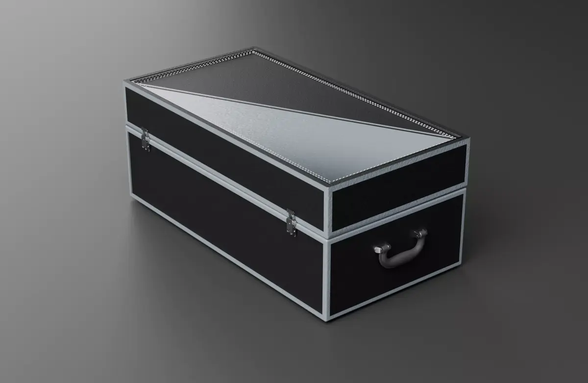 A high-detail 3D model of a premium storage trunk featuring a dual-tone leather finish. The design combines a deep black pebbled leather body with a geometric grey leather lid insert, accented by brushed steel framing and heavy-duty latches.