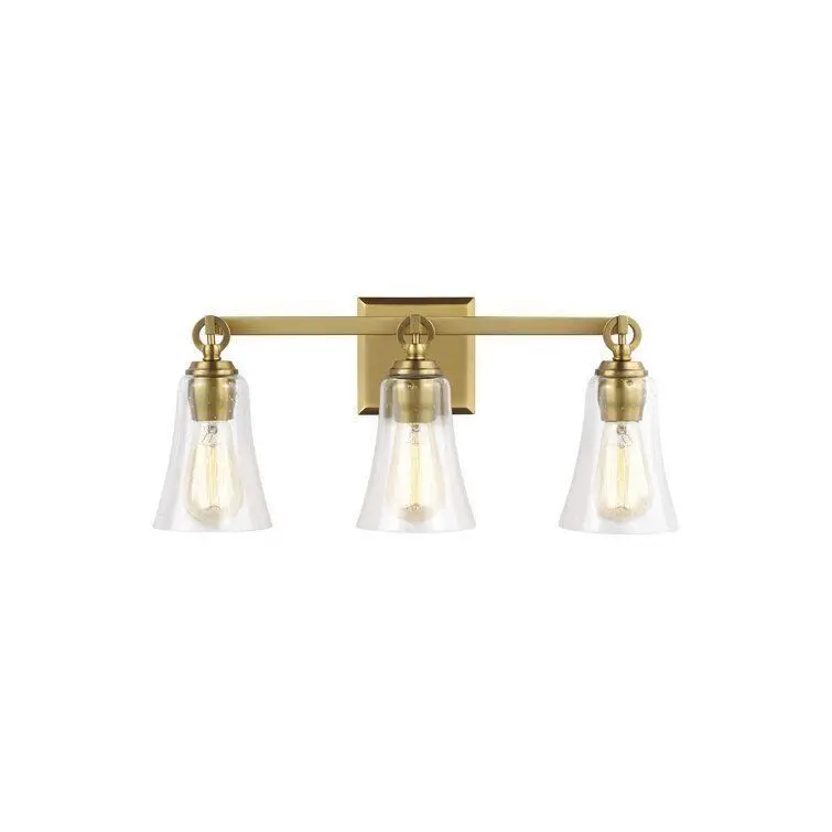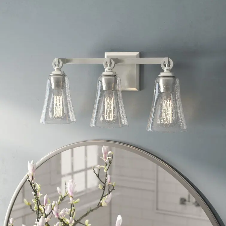 - The 3 light vanity light in offers shadow-free lighting in your powder room, spa or master bathroom. This bathroom lighting features beautiful, tapered, bell-shaped glass shades that emulate the shape of a tulip. Fixtures feature exquisite cast details including a cast backplate and cast ring and hook hardware that elegantly support the shades. It can be mounted either up or down.
