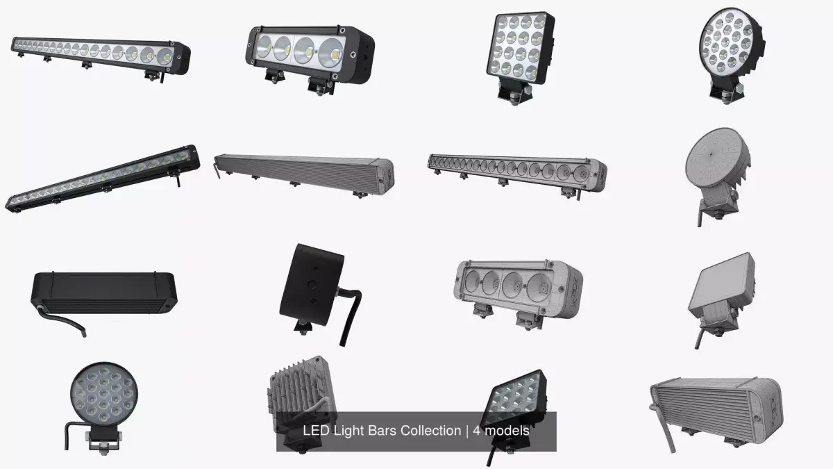 A collection of detailed 3D models of 4 LED light bars , modeled in Cinema 4D and rendered with V-Ray. The models were created using approximate real world dimensions.