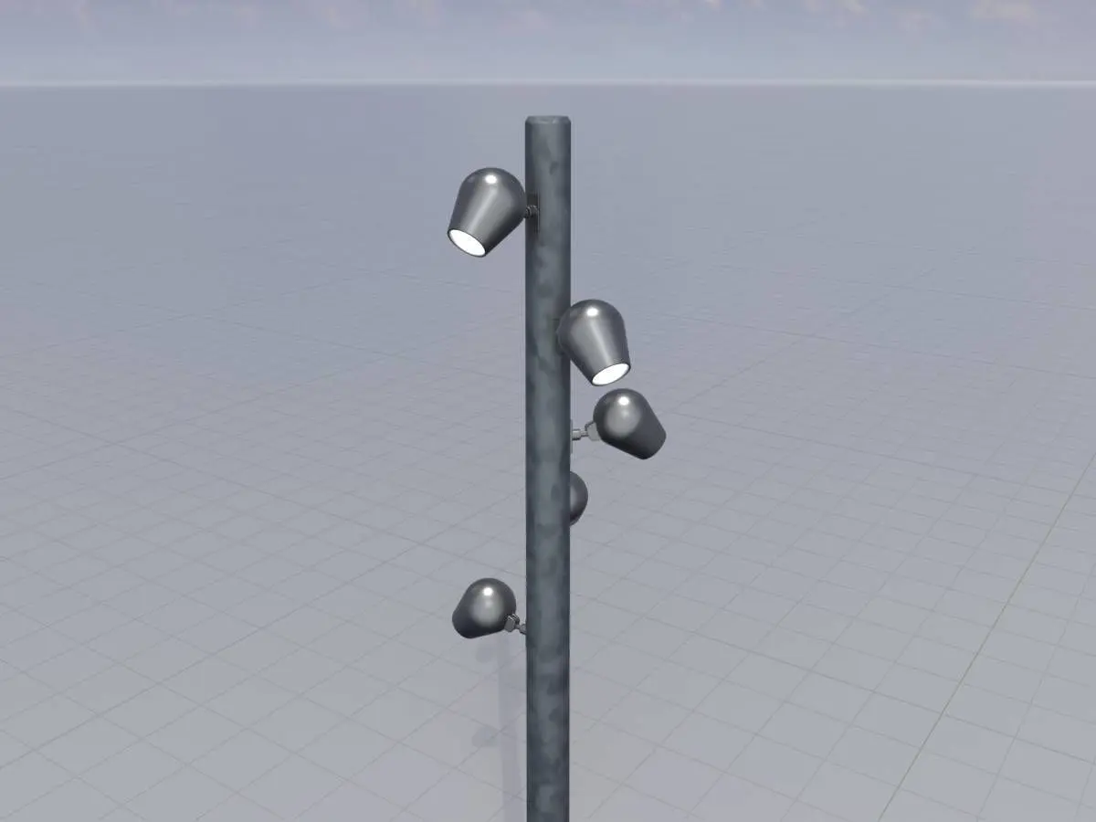 Hier ist ein 3D Modell einer LED Lichtstele mit 5 Leuchten aus verzinktem Metall. Das 3D-Modell ist der Realität nachempfunden und hat eine Höhe von 9 Metern. Es wurde für den Einsatz in Echtzeitanwendungen wie 3D-Visualisierungen oder Videospielen entwickelt und optimiert. Der Objekt-Einfügepunkt ist logisch gewählt, so dass Sie das Modell leicht in Ihren 3D-Szenen platzieren können. Die Texturen haben eine Auflösung von 4096 x 4096 px und entsprechen dem PBR-Workflow (Base-Color, Roughness, Metalness, Normal).