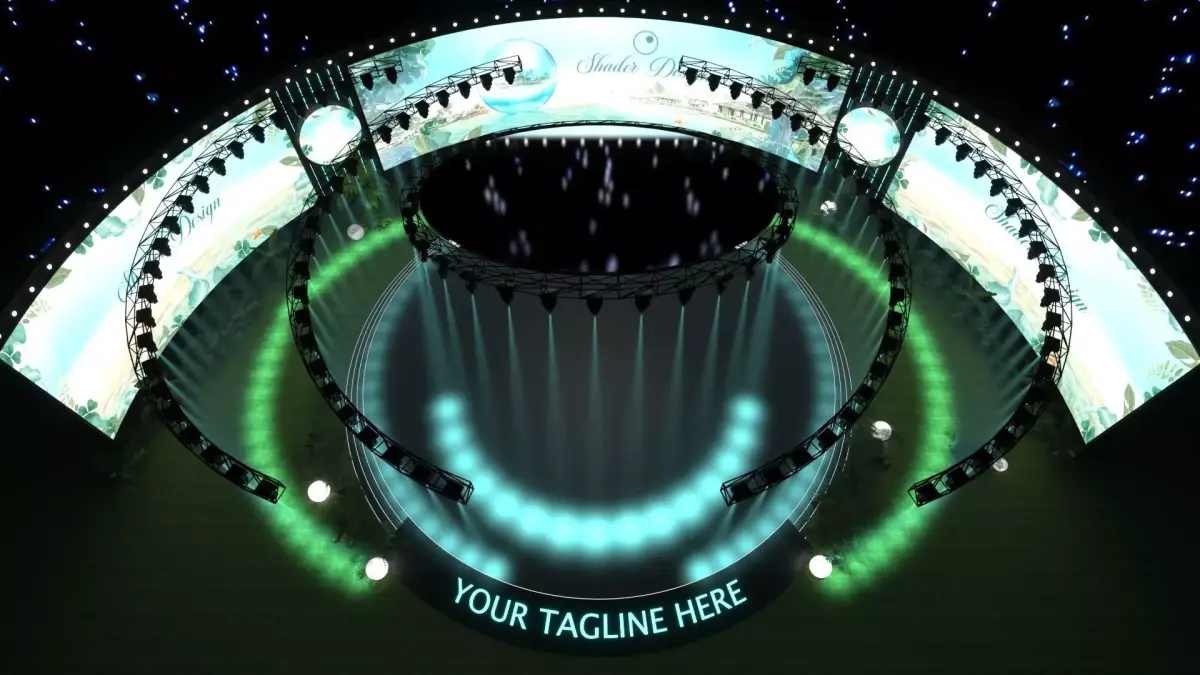 What's Included:Fully detailed stage structure with LED trim, circular panels & center backdropPre-set night event lighting with starlit sky backgroundHigh-resolution PBR textures (tropical foliage, LED screens, reflective platform)Glowing sphere prop modelsTropical plant arrangements (banana leaves, palm trees, ground cover)Render-ready scene setup