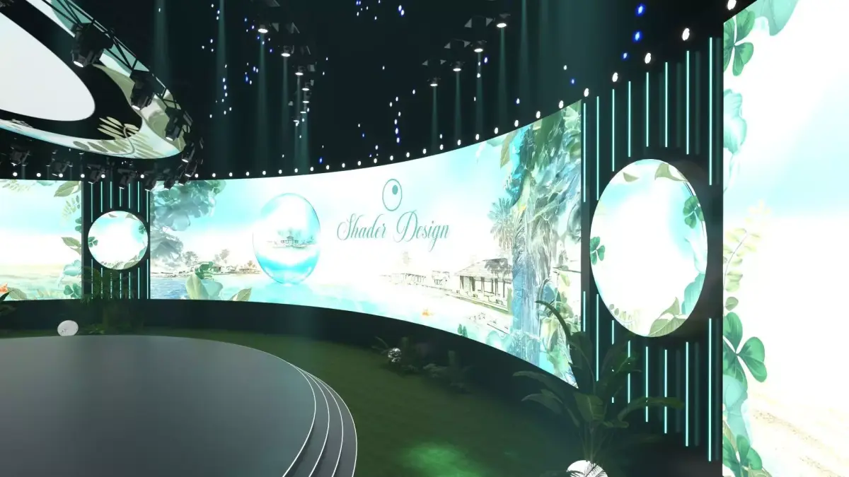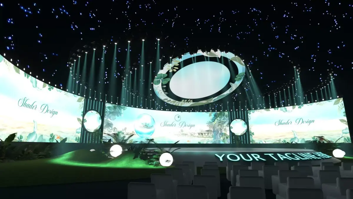 Design Concept – Tropical LuxuryThe stage combines a curved multi-tiered LED platform with glowing neon trim edges, three oversized rounded LED display panels showcasing tropical greenery visuals, and a wide panoramic center backdrop depicting a resort-style landscape. Elegant glowing sphere floor lamps and lush tropical plants complete the atmosphere — creating an immersive event experience that feels both premium and inspired by the pure dewdrops of nature.This design language speaks directly to real estate developers launching resort villas, eco-townships, tropical condominiums, or beachside properties — where the stage itself becomes part of the brand story. Above, an oval LED ring suspended mid-air adorned with tropical leaf motifs, reflecting light down onto the stage to create a magical sense of depth. Stage lights cascade from the ceiling like rays of sunlight piercing through a forest canopy, blending seamlessly with the starlit night sky above — delivering an event space that is both grand and refined, the very definition of elegance.