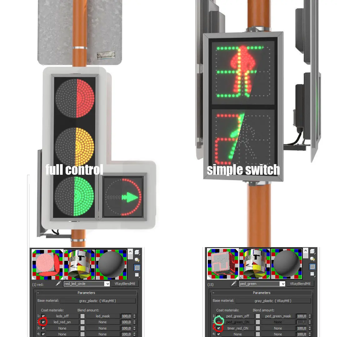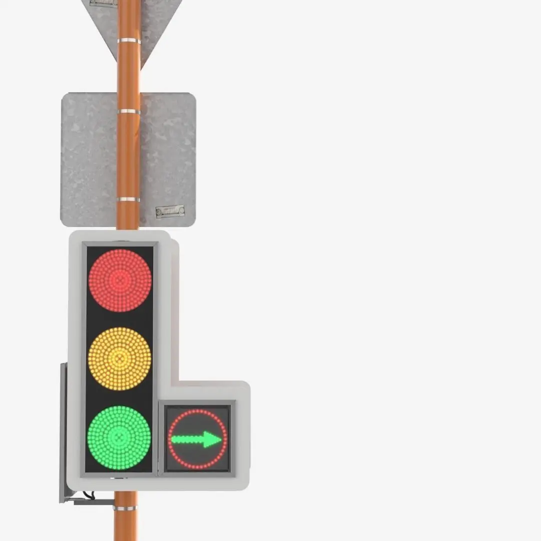 The status of the traffic light is switched in material, each section is controlled individually. All sizes are standardized, signs and traffic lights are tied to posts. Easy to combine for different intersections.