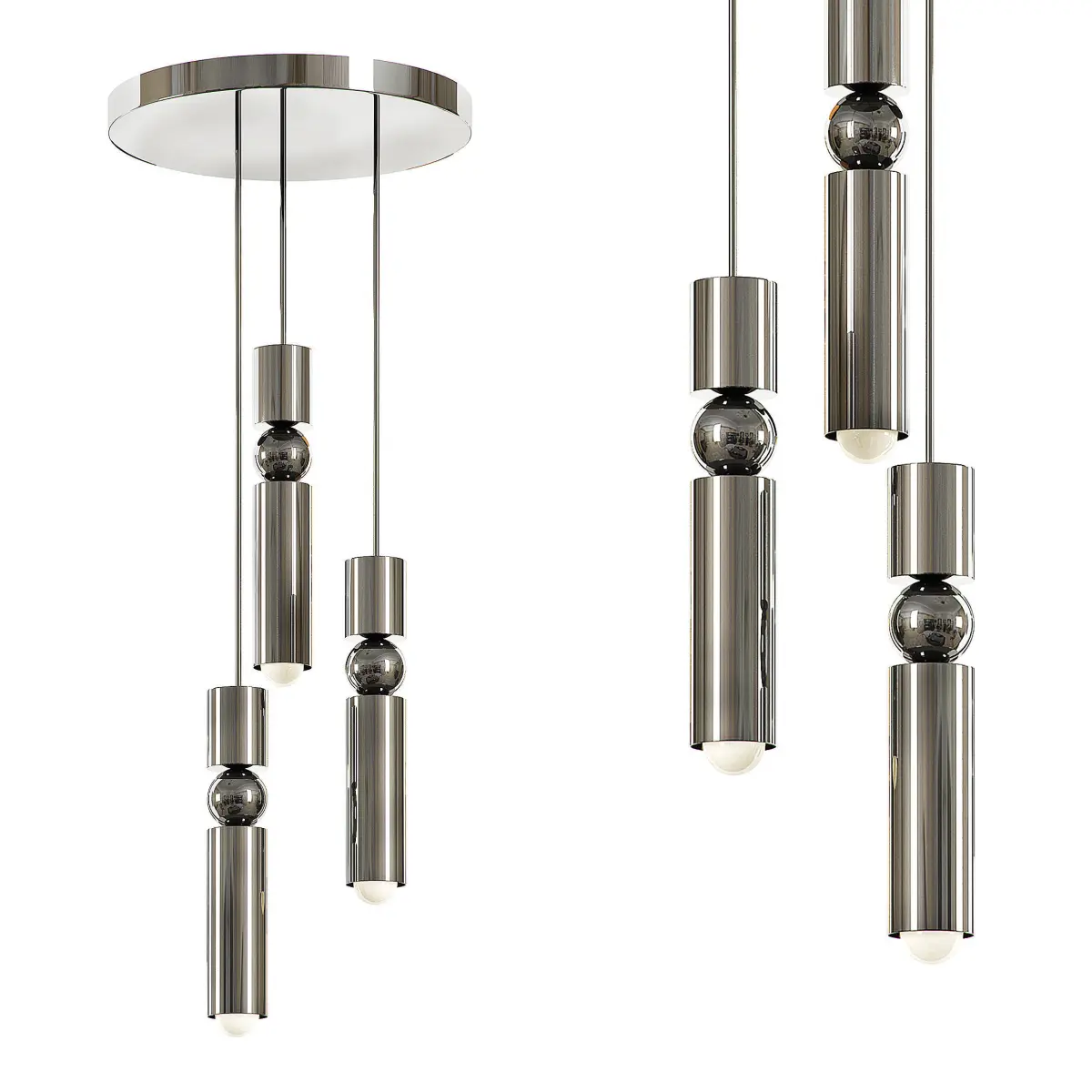 LEE BROOM FULCRUM CHANDELIER 3 IN 1 Finishes: Polished Gold, Polished Chrome, Matte BlackThe Fulcrum Chandelier features three Fulcrum Lights suspended at set lengths from a matching finish ceiling plate and creates a dramatic cluster that is simple to install.