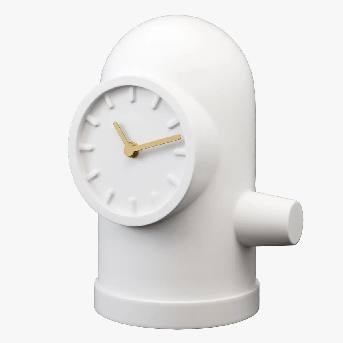 LEFF Amsterdam Base Table Clock is inspired by industrial designs and has an appearance reminiscent of a modern sculpture. It combines minimalism and functionality in a striking design that looks at home in sleek contemporary homes and eclectic interiors in equal measure, standing out in any décor. The table clock takes the timepiece design to a fresh visual dimension. The handmade ceramic base boasts a matte black finish, providing the perfect backdrop for the brass covered aluminum hands that add contrast and a touch of golden brightness. The clock features a Japanese movement and is also available in white.