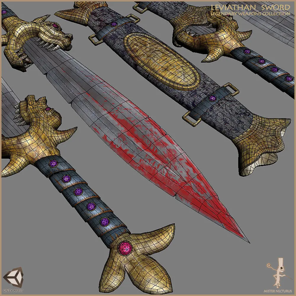 Sword together with Scabbard are 7,015 polygons, 13,104 triangles, 7,112 vertexes.LOD version of Sword with Scabbard are 3,649 polygons, 6,646 triangles, 3,829 vertexes.