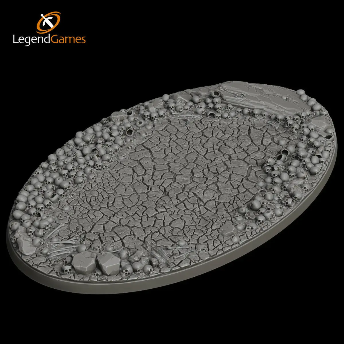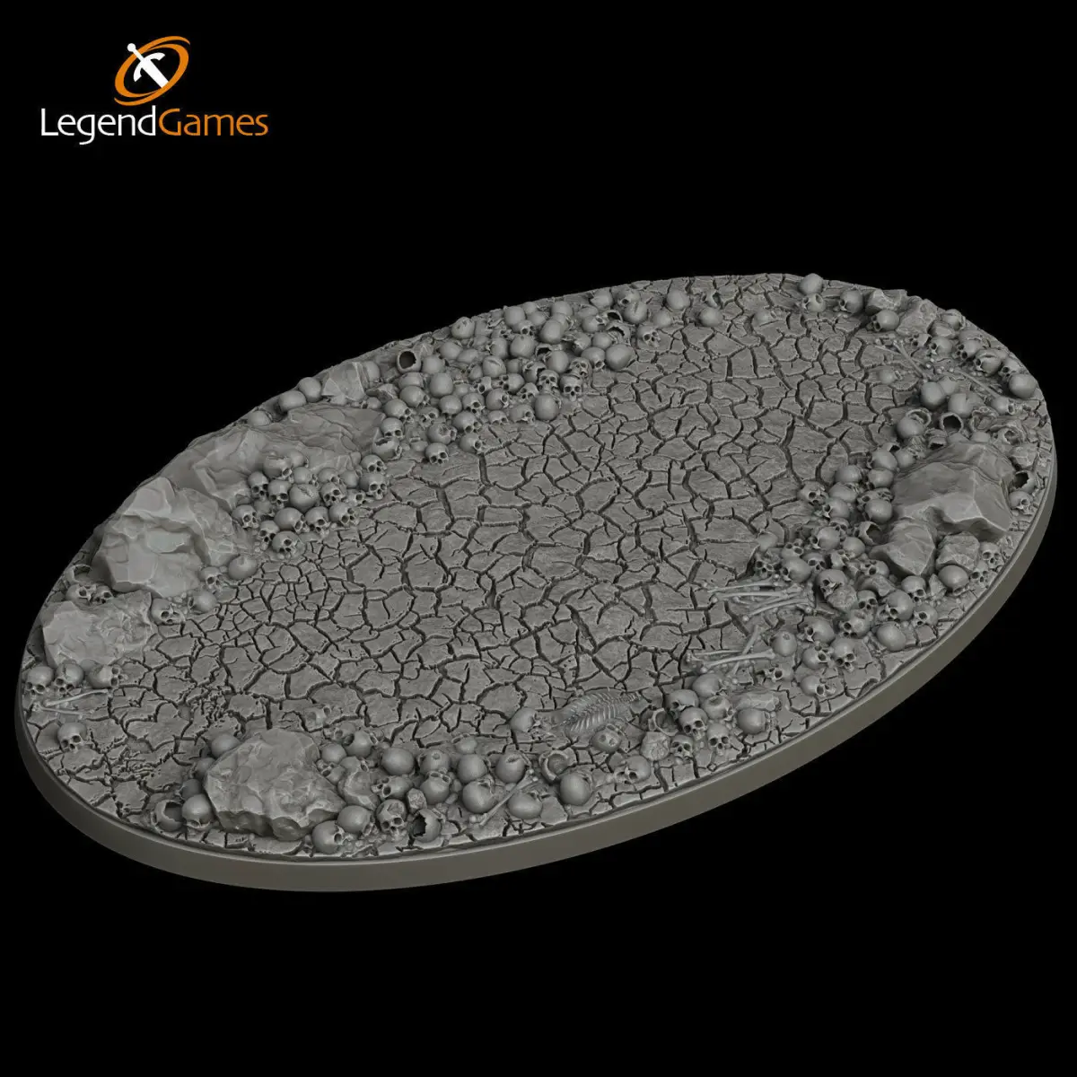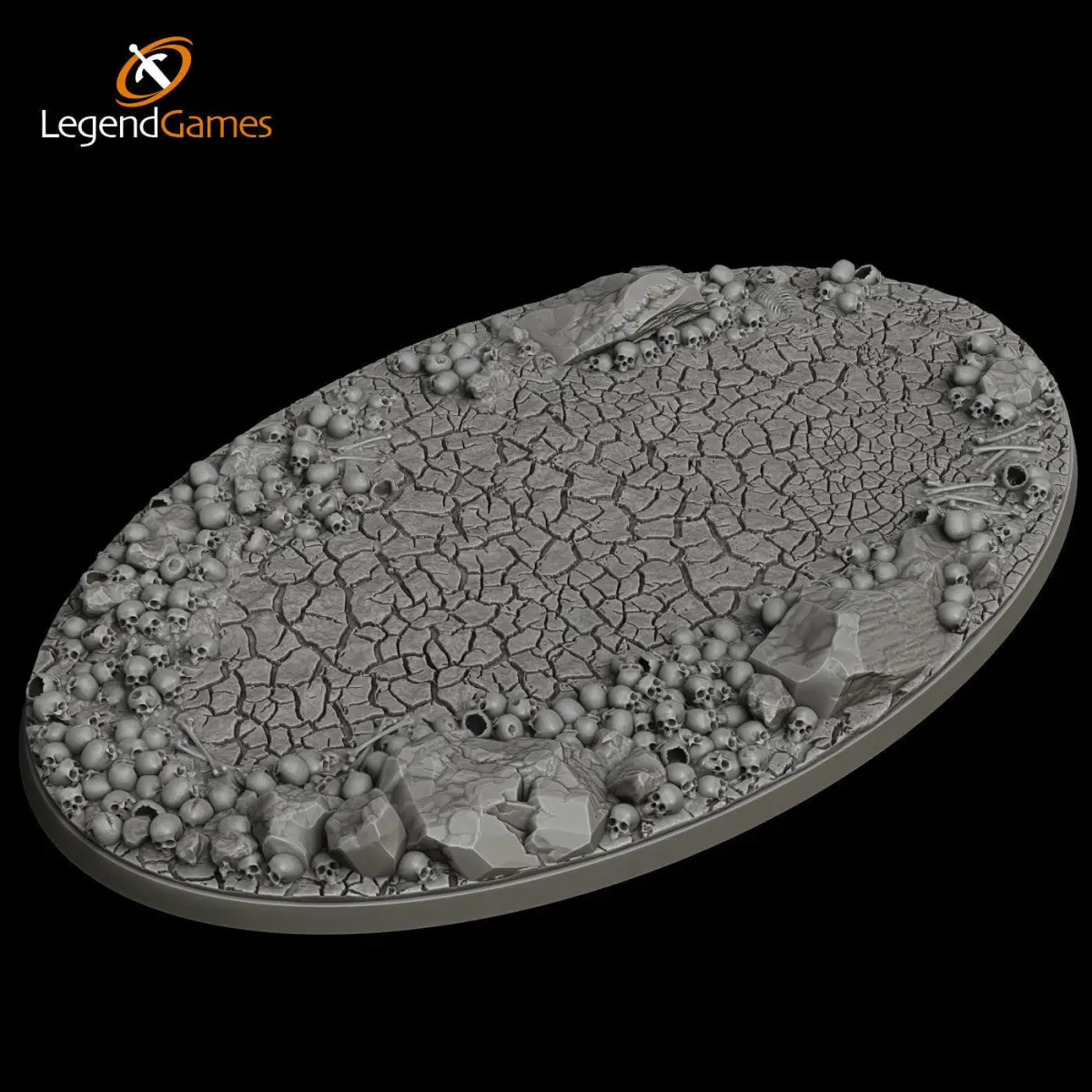 Legendgames Skull Bases come in a variety of designs, from full-skull models to open terrain with a few scattered skulls and long bones.Our base is usually a cracked earth surface with scattered rocks and stones intermingled with skulls and long bones.Some of our bases might feature shifting sands, bubbling mud or rocks and crystals, but in general they all have a consistent look and feel to give your armies a uniform look.Our bases feature a selection of skulls and bones, not just multiples of the same item. A lot of thought goes into positioning and aesthetics - these are not cheap cookie-cutter bases, these are top notch!