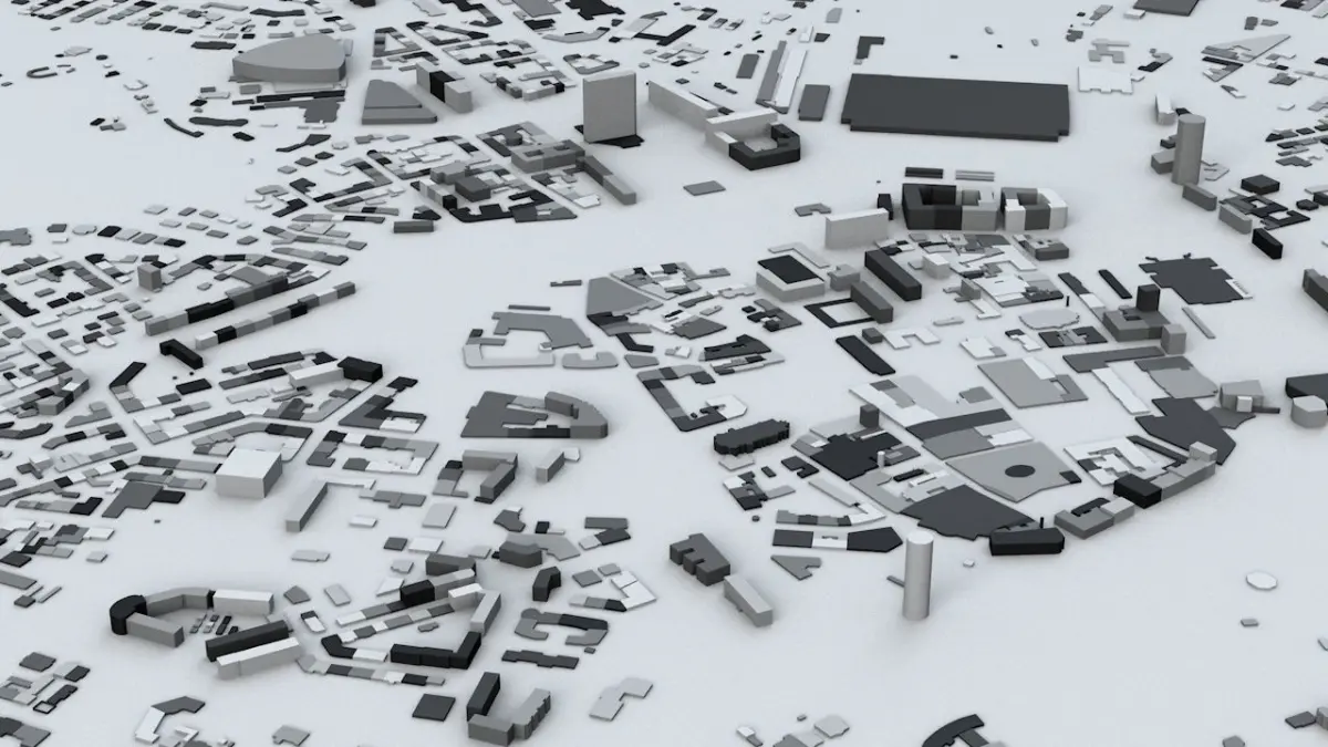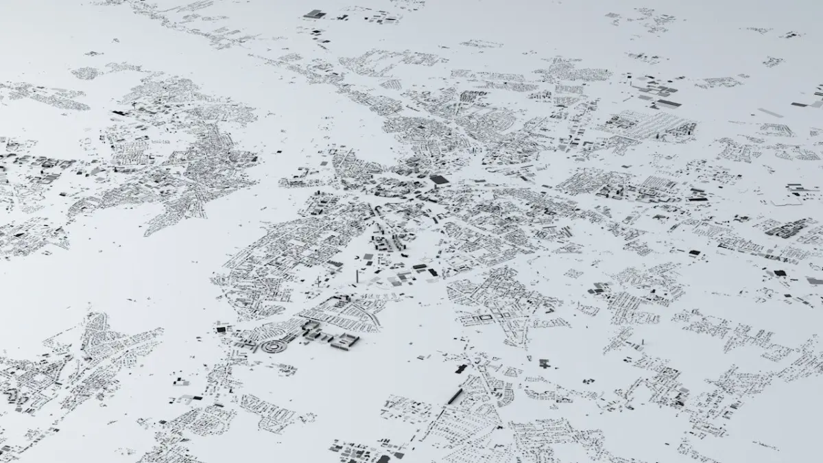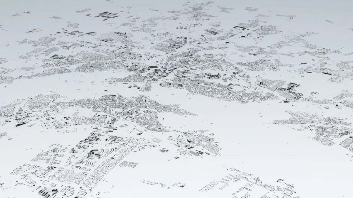 - the model is positioned on a flat surface (all buildings are on the “floor” - no elevation data included)
