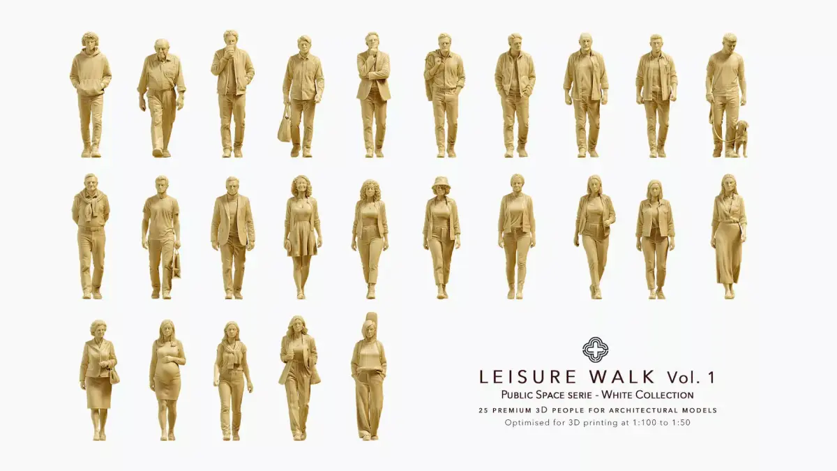 Leisure Walk Vol. 1 - Public Space Collection is a set of 25 architectural figures designed to bring a sense of calm, everyday life to your urban scenes. All characters are captured mid-stride, walking at a relaxed pace, perfect for plazas, boulevards, promenades and public squares. While Urban Walk evokes commuters and business districts, Leisure Walk is all about strolling, wandering and taking time - ideal for parks, waterfronts, mixed-use developments and campus projects.