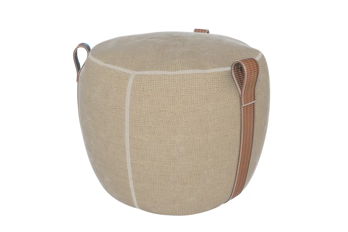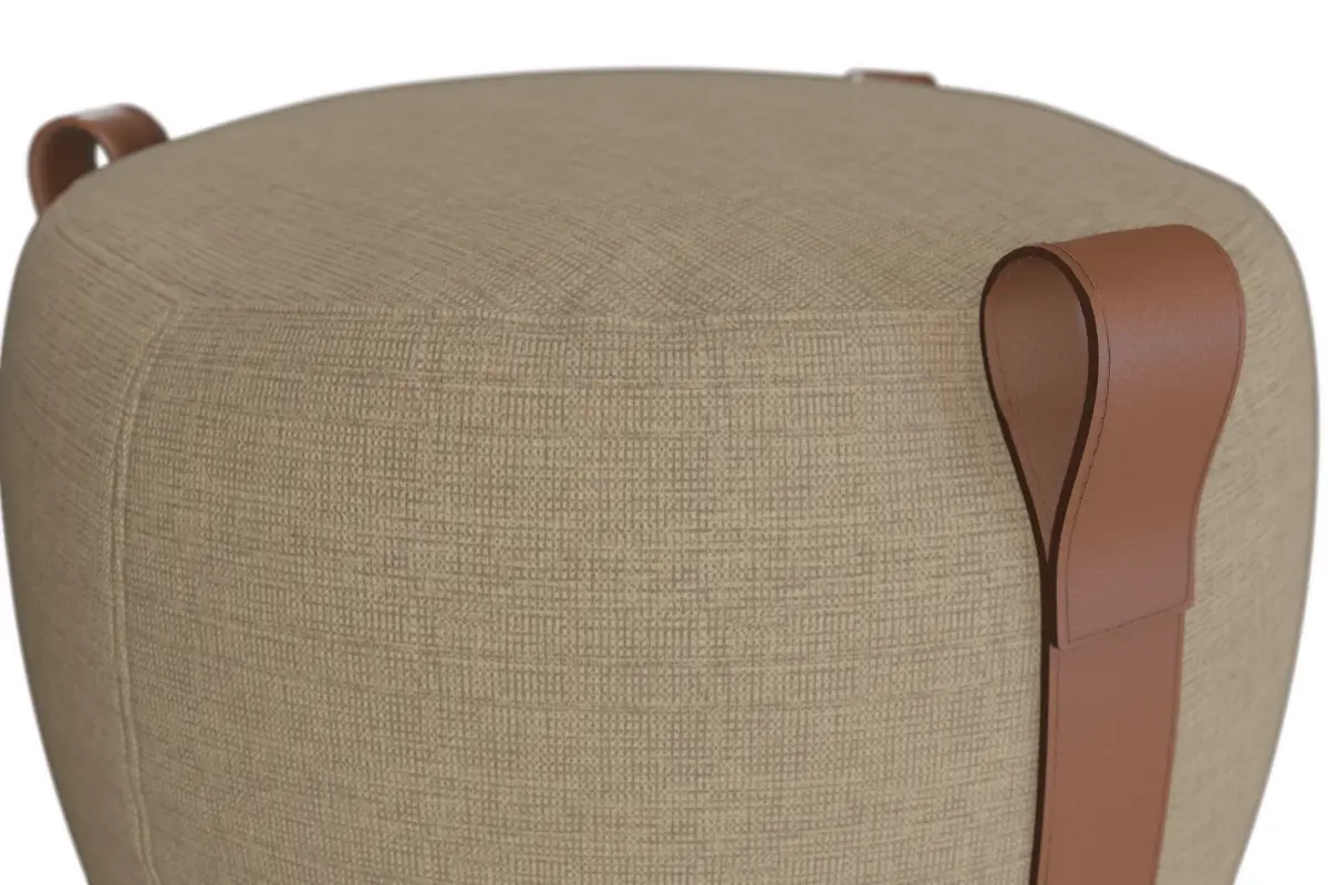 This is a highly detailed PBR (Physically Based Rendering) 3D model of the Lema Notch Pouf, a contemporary and versatile furniture piece. The pouf features a soft, rounded shape upholstered in a neutral-toned fabric, complemented by distinctive natural leather straps that double as stylish handles. This elegant and functional pouf is perfect for adding flexible seating, a footrest, or a decorative accent to modern living rooms, lounges, bedrooms, or reception areas in any architectural visualization.
