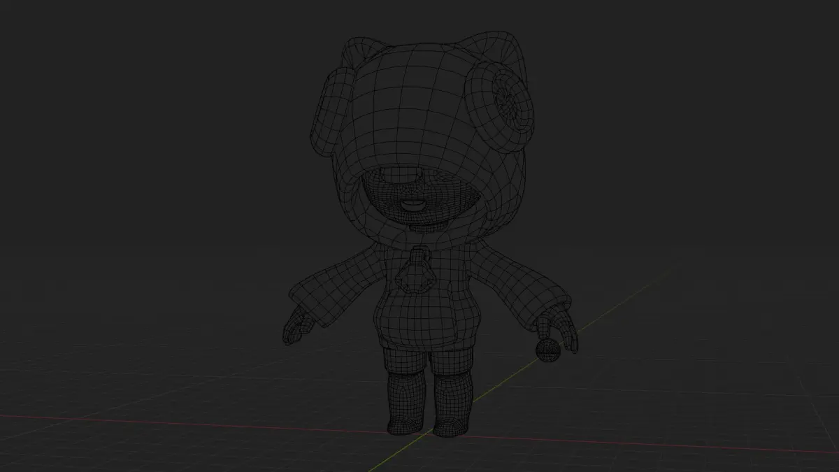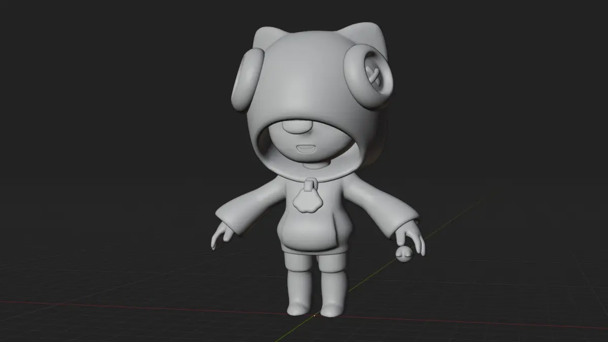 Clothing: A blue “belly” and a gray element, possibly mimicking a spot or decoration, are visible under the hood. The character wears blue shorts.