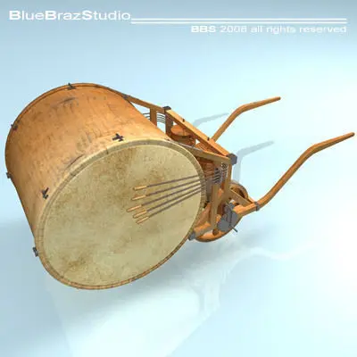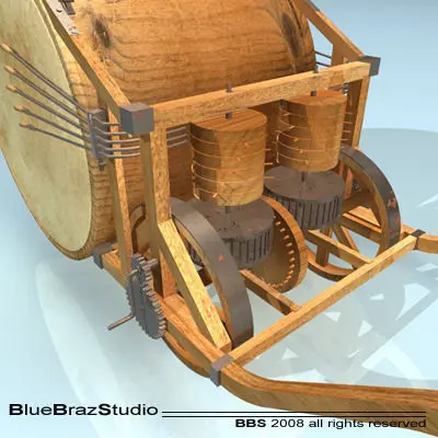Detailed model of Leonardo's mechanical drumRendered with C4D.All materials and textures are included,but it could need some texture reassigning.Material enclosed for c4d only.PolygonalPolygons 23502Vertices 26568The drawing is a cart equipped with a mechanical drum. When pulled or set in motion by a handle, the gears turn the two lateral drums which are fitted with pegs (cams). These pegs, which can be placed in various positions, move ten sticks (five on each side) that beat the large drum on the back. Changing the position of the pegs alters the rhythm of the music.