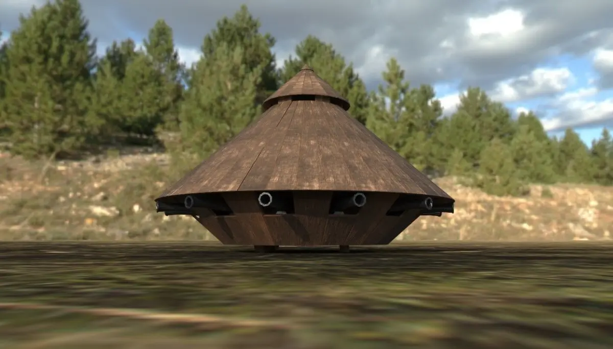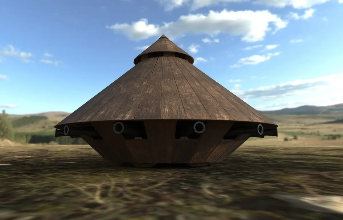This is a tank drawed by Leonardo da Vinci. In real life it was designed to scare the enemy more than killing them because it would be hard to move or aiming, but you can use it like you want, it can be a tank or the top of a bombarder tower, or a kind of rustic UFO. I acept advice and hints