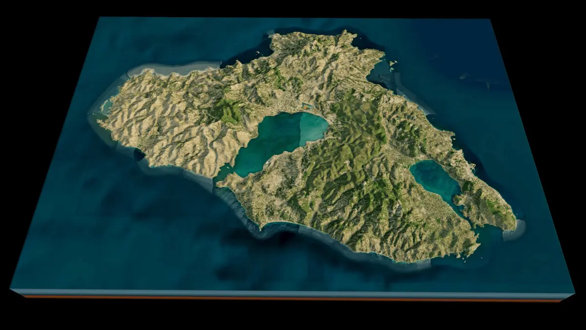 Lesbos Island 3d model terrain. 3d model of the Island of Lesbos with its landscape of mountains, beaches and forests.