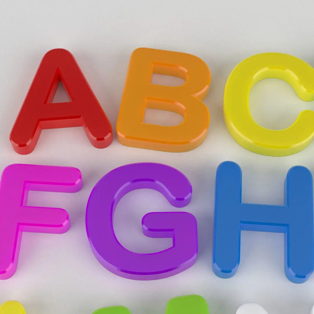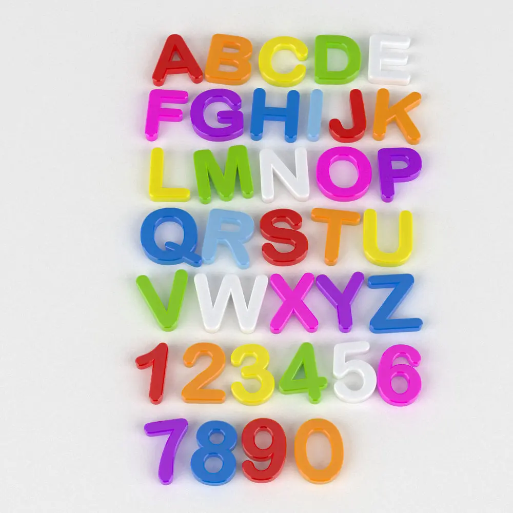 A detailed set of magnetic alphabet coloured fridge magnet letters 3D models.