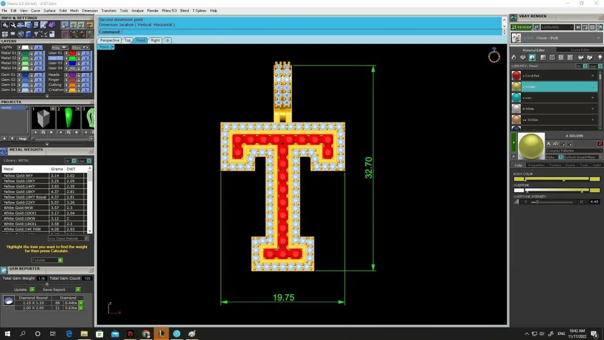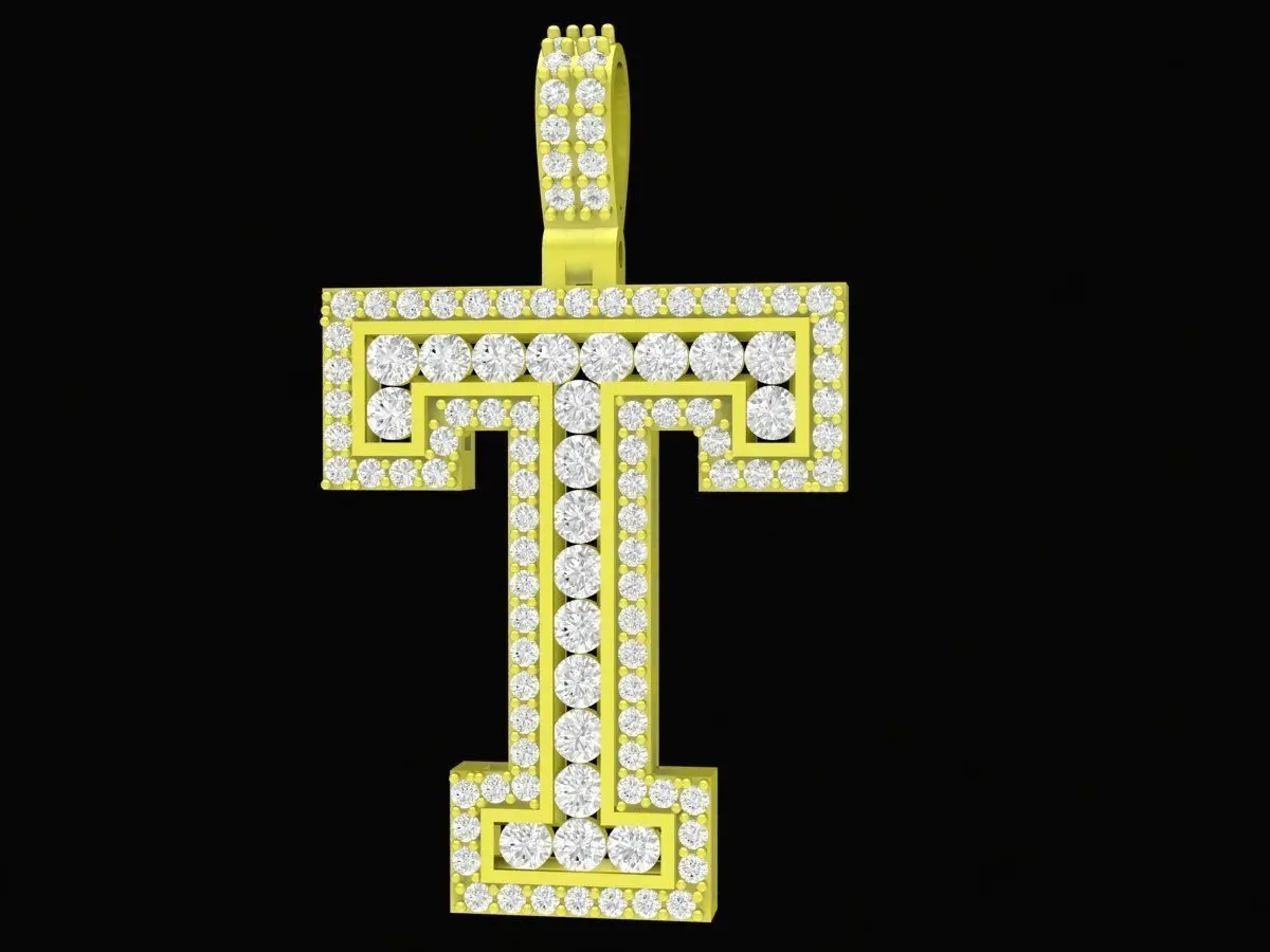 This letter T pendant 3D model features a bold initial design decorated with precisely arranged gemstone settings. The geometric structure highlights the strong and modern appearance of the letter, while the surrounding stone layout adds brilliance and luxury to the overall look. The clean edges and balanced proportions create a visually striking pendant suitable for personalized jewelry collections.