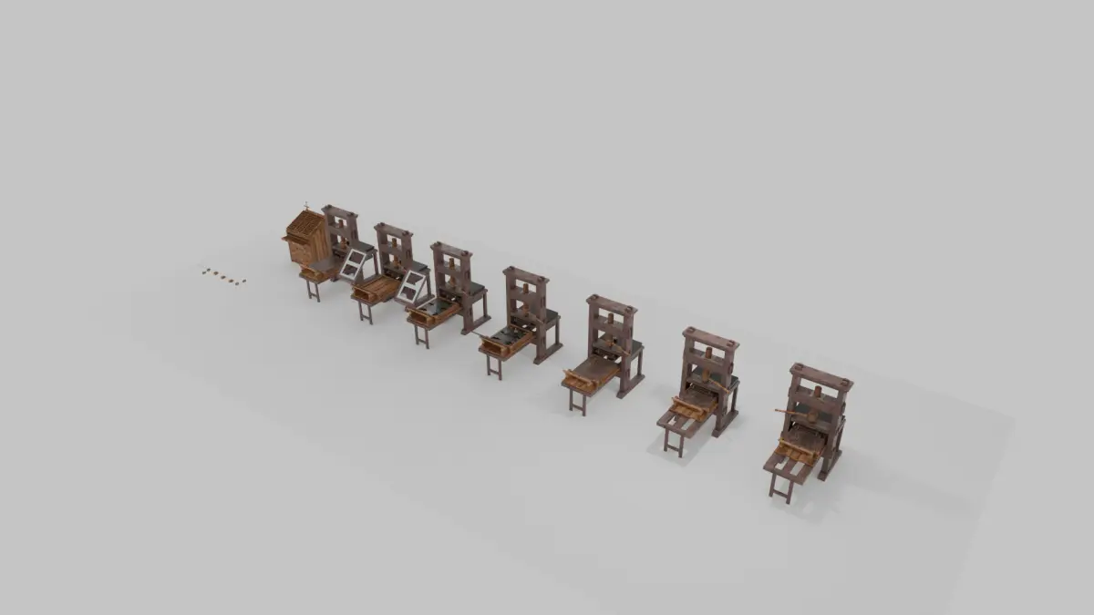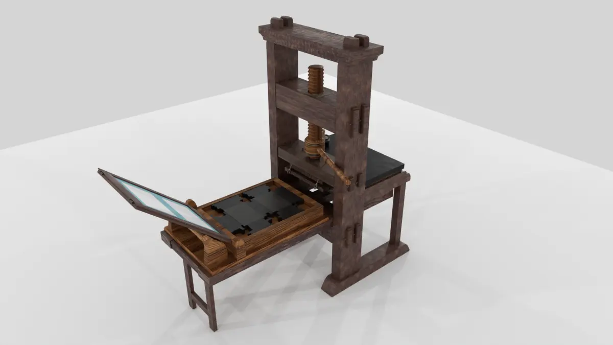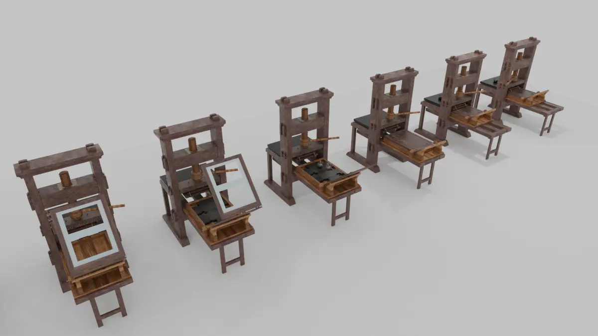 I model an early letterpress, a type cabinet, and a mold for making letterpresses all together based on actual model at the Basel Papermill museum in Switzerland.The letterpress is modeled separately for each of its working steps, which are arranged in order.The models of the letterpress are arranged in the following order: punch, matrix, and type.Please use the model for the part you need.
