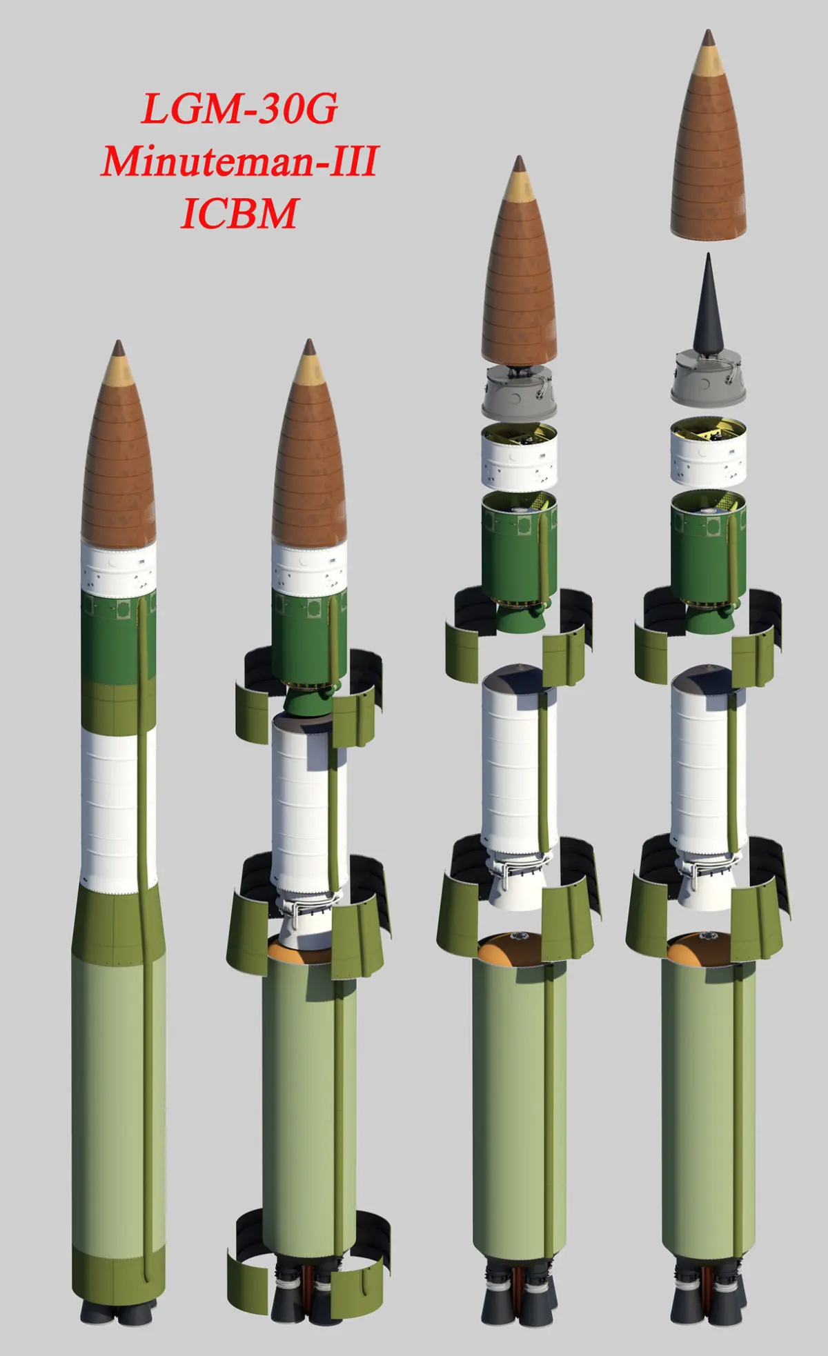 LGM-30G Minuteman-III ICBMFull scale, high-detailed 3D model of LGM-30G Minuteman-III US intercontinental ballistic missile (ICBM)Extremely detailed, highly accurate in 1:1 scale. Coordinates of the location of the model in space (x0, y0, z0). Each stage of the rocket is executed separately, which makes it possible to create animations. In the model there is animation, for its viewing move the slider on the animation scale in 3ds Max.There is no need for third-party plugin or something else. Light, materials and visualization is done in mental ray which is integrated into the program 3ds Max, so you will not need third-party plug-ins.