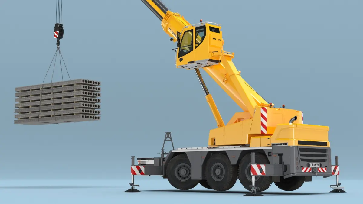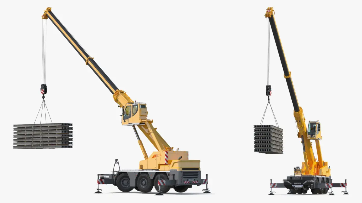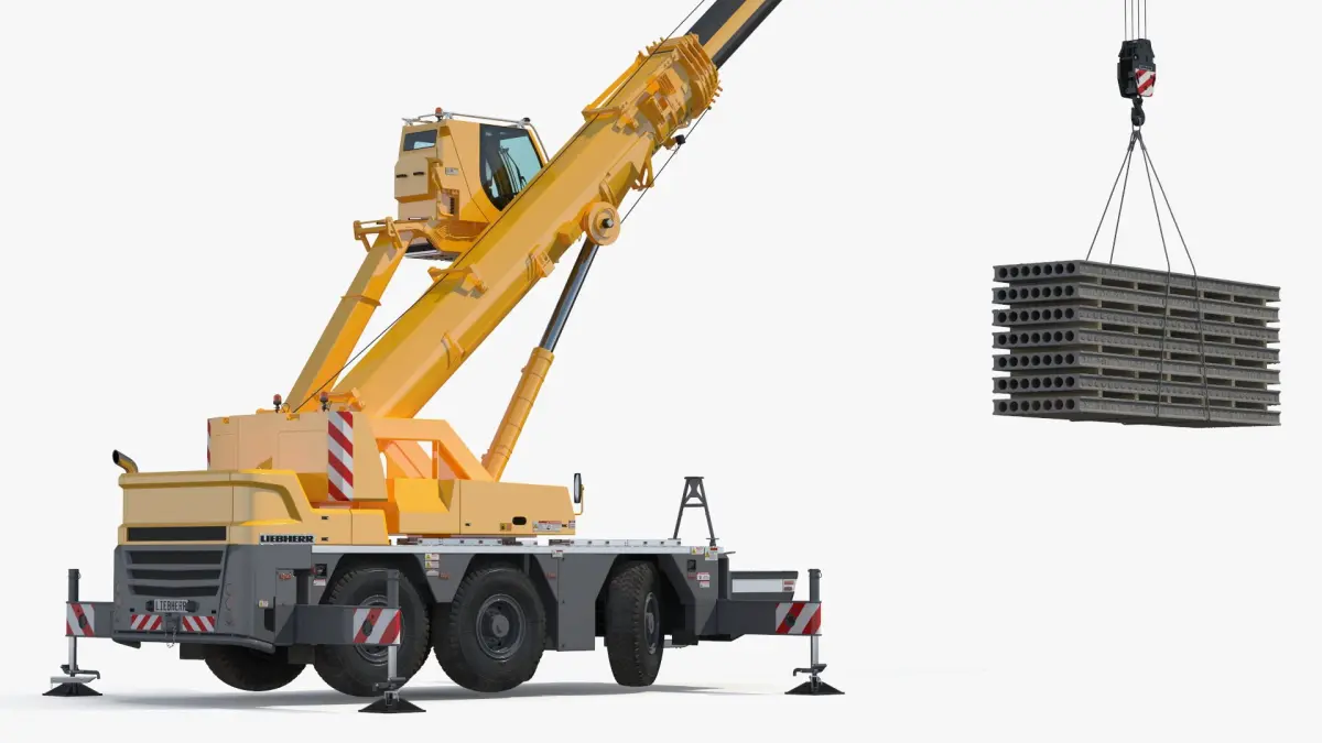 This model showcases a mobile crane with an extendable boom and sturdy outriggers for stability. The crane is equipped with a hook lifting several concrete slabs, highlighting its capability for heavy lifting tasks.