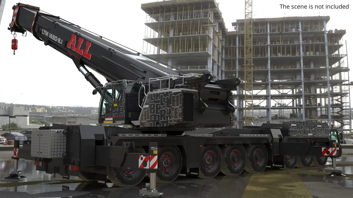 Liebherr Mobile Crane LTM 1450 81 Folded Black Rigged is fully rigged and is ready to be animated. You can easily position it the way you need or animate it the way your project requires using helpers in 3D Studio Max. See the turntable to get an idea of how rigging works.