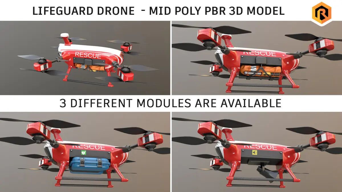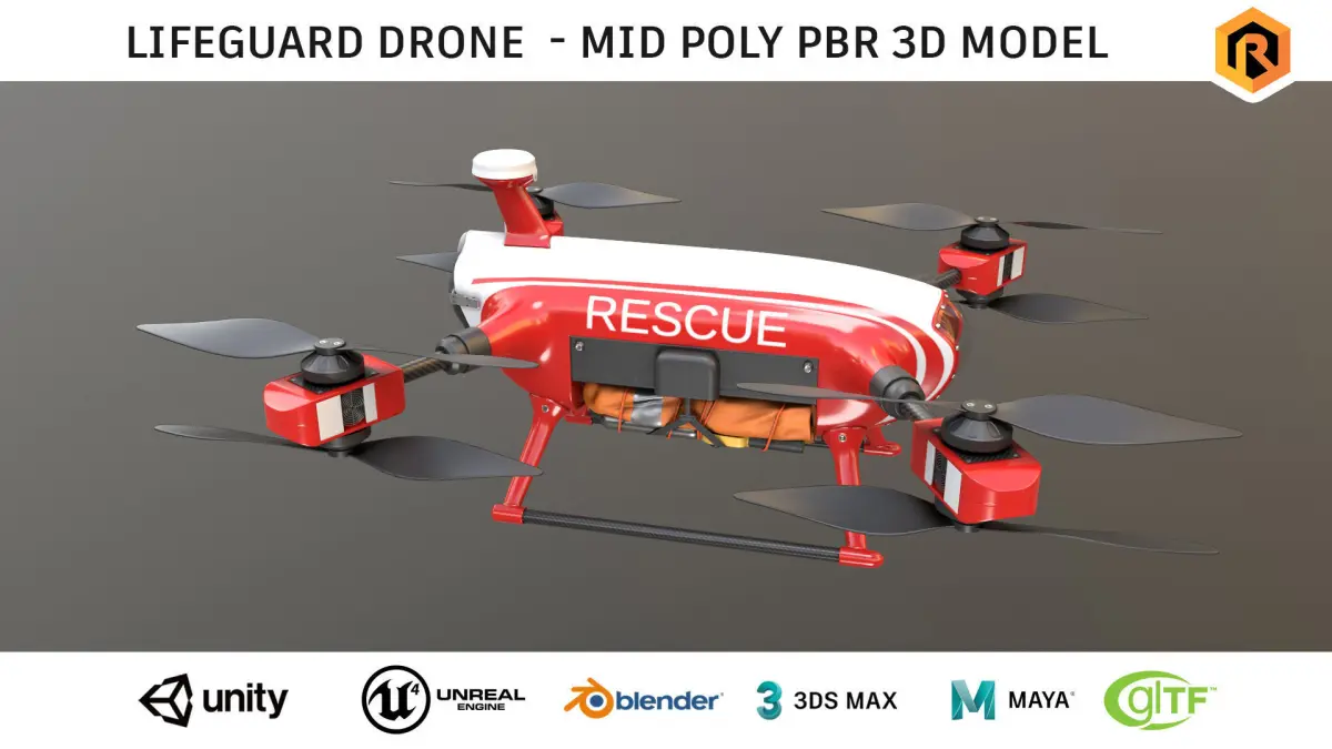 High-quality PBR low-poly 3D model of Lifeguard Drone. The camera and propellers are separate objects so you can animate and rotate them.