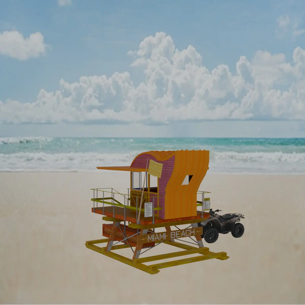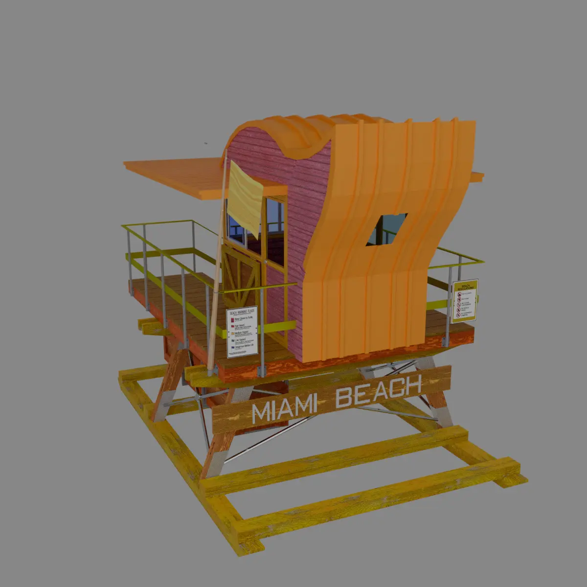 This Lifeguard Tower model was influenced by those built after Hurricane Andrew hit South Florida in 1992. The City of Miami Beach had a design team fashion new lifeguard towers to replace five damaged in the storm. When crafting the towers, the designers drew inspiration from the city itself. Miami Beach is famous for its Art Deco-style buildings, and they took a cue from the buildings that define the city, along with its rich melting pot of cultures. The lifeguard towers were influenced not only by Miami’s mid-century and Art Deco architecture but also by its Caribbean culture and the use of vibrant colors derived from the natural beauty of the tropics.-This model is suitable for use in any Blender 4.0 or later version scene or animation.-This model file contains 27 objects.-This model contains only node color and textures.